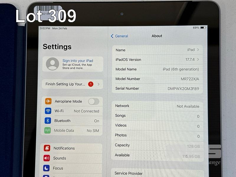 APPLE iPAD 6TH GEN, 128GB, Wi-Fi, CELLULAR, SPACE GREY, MODEL MR722X/A, A1954 WITH COVER (NO CABLE, NO CHARGER) S/N:DMPWX2GMJF89