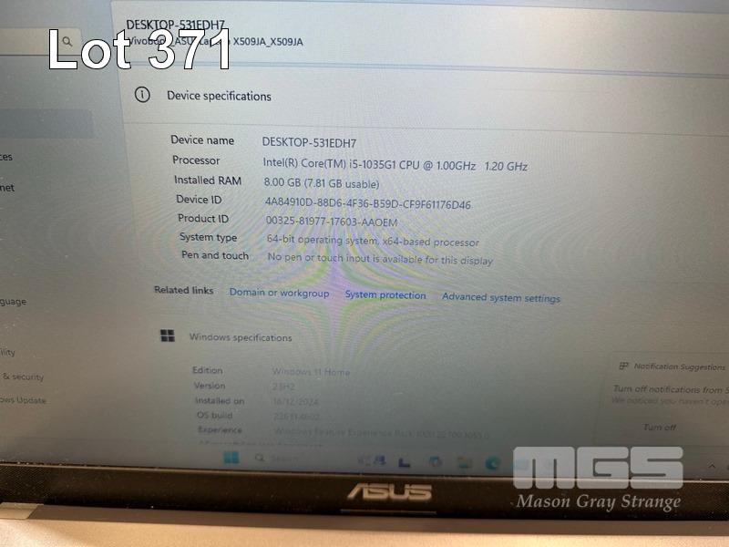 LAPTOP, ASUS VIVOBOOK X509JA, CORE i5 1035G1 (10TH GEN) @ 1GHz, 8GB RAM, 512GB NVMe M.2 SSD, 15.6" WIDESCREEN (1366x768), INTEL UHD GRAPHICS, Wi-Fi, BLUETOOTH, WINDOWS 11 HOME INSTALLED (NO POWER SUPPLY) S/N:LBN0CX25076749F