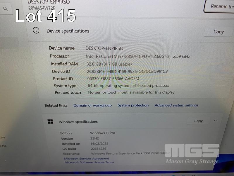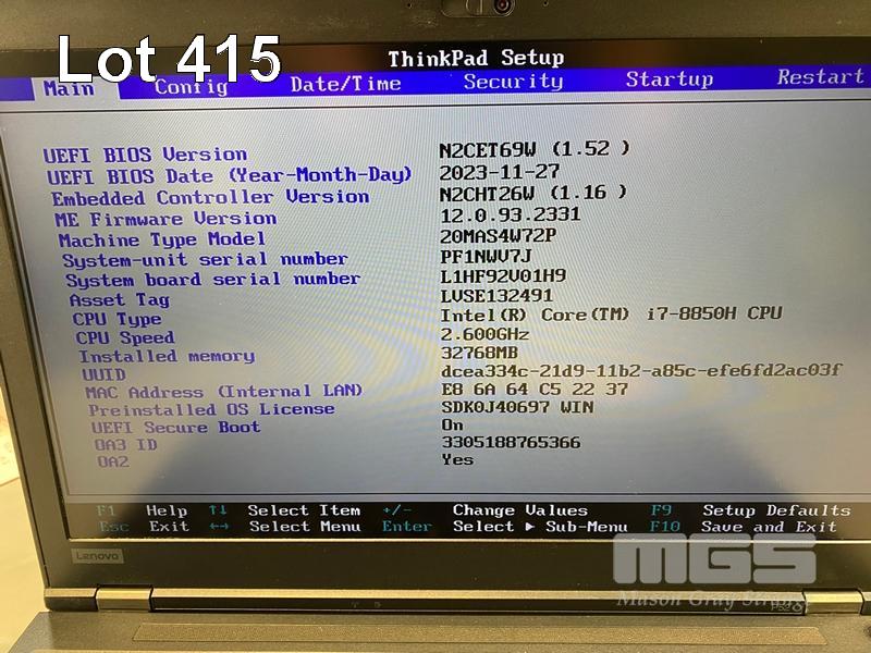 LAPTOP, LENOVO THINKPAD P52 MOBILE WORKSTATION, TYPE 20MA, CORE i7 8850H (8TH GEN) @ 2.6GHz, 32GB DDR4 RAM, 512GB NVMe M.2 SSD, 15.6" WIDESCREEN (1920x1080), 4GB NVIDIA QUADRO P2000 VIDEO, Wi-Fi, BLUETOOTH, WINDOWS 11 PRO INSTALLED & POWER SUPPLY (NOTE: MARKS ON SCREEN) S/N:PF1NWV7J