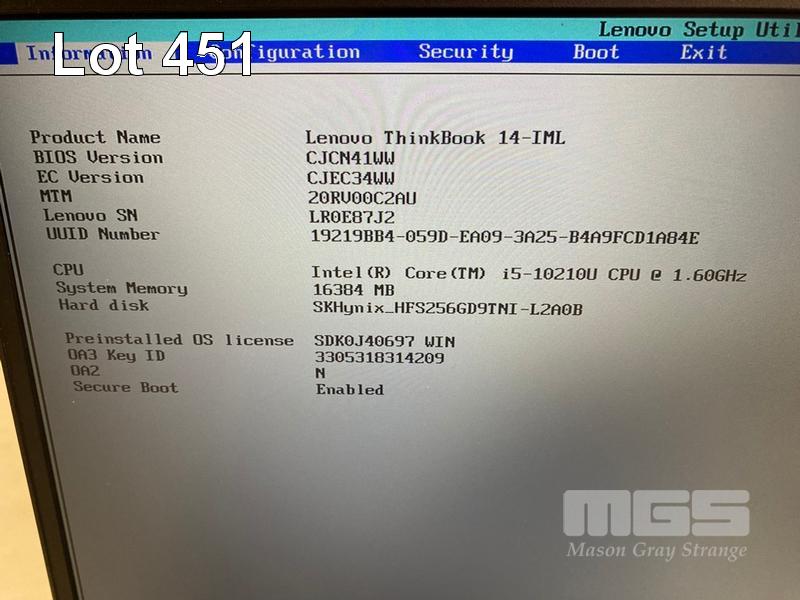 LAPTOP, LENOVO THINKBOOK 14-IML, TYPE 20RV, CORE i5 10210U (10TH GEN) @ 1.6GHz, 16GB DDR4 RAM, 256GB NVMe M.2 SSD, 14" WIDESCREEN (1920x1080), INTEL UHD GRAPHICS, Wi-Fi, BLUETOOTH, WINDOWS 11 PRO INSTALLED & POWER SUPPLY (NOTE: MINOR MARKS ON SCREEN) S/N:LR0E87J2