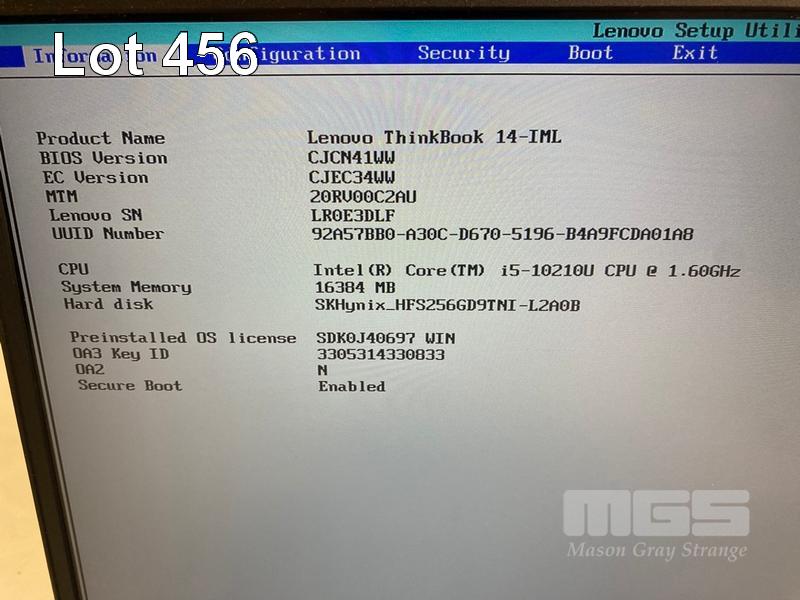 LAPTOP, LENOVO THINKBOOK 14-IML, TYPE 20RV, CORE i5 10210U (10TH GEN) @ 1.6GHz, 16GB DDR4 RAM, 256GB NVMe M.2 SSD, 14" WIDESCREEN (1920x1080), INTEL UHD GRAPHICS, Wi-Fi, BLUETOOTH, WINDOWS 11 PRO INSTALLED & POWER SUPPLY (NOTE: MISSING RUBBER STRIP UNDERNEATH, MARKS ON SCREEN) S/N:LR0E3DLF