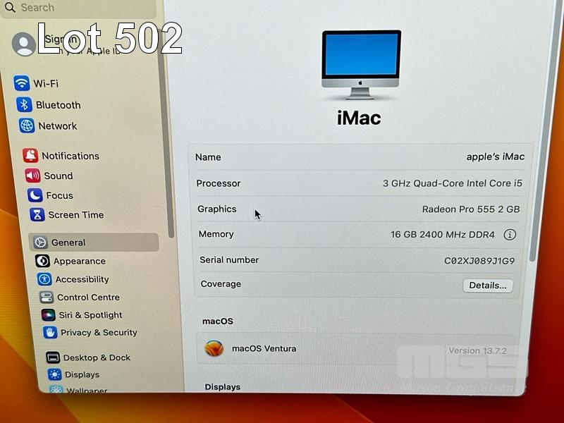 APPLE iMAC (A1418), CORE i5 7400 (7TH GEN) @ 3GHz, 16GB DDR4 RAM, 1TB FUSION DRIVE, BUILT-IN 21.5" RETINA DISPLAY (4096x2304), 2GB RADEON PRO 555 VIDEO, Wi-Fi, BLUETOOTH, MAC OS 13 INSTALLED, MACALLY KEYBOARD & MOUSE S/N:C02XJ089J1G9