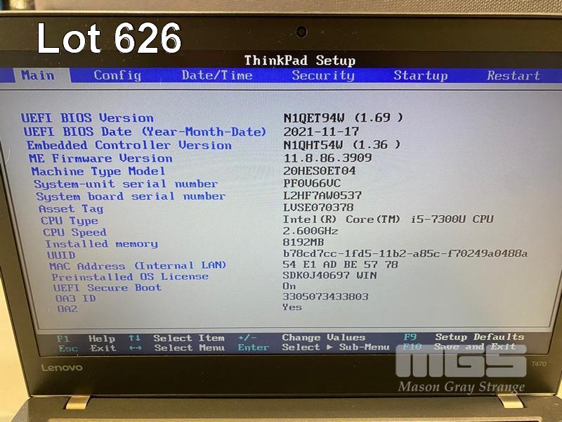 LAPTOP, LENOVO THINKPAD T470, TYPE 20HE, CORE i5 7300U (7TH GEN) @ 2.6GHz, 8GB DDR4 RAM, 256GB NVMe M.2 SSD, 14" WIDESCREEN (1366x768), INTEL HD VIDEO, Wi-Fi, BLUETOOTH, WINDOWS 10 PRO INSTALLED & POWER SUPPLY (NOTE: SWOLLEN BATTERY, BATTERY 2 NOT CHARGING) S/N:PF0V66VC