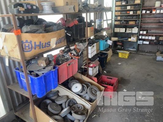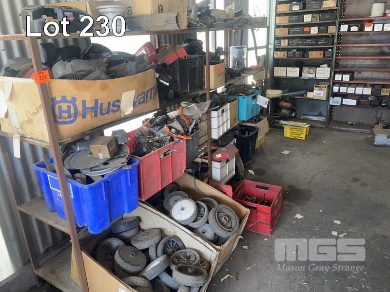 ASSORTED SPARE PARTS, ENGINE COMPONENTS, CUTTING DECKS, WHEELS, ETC