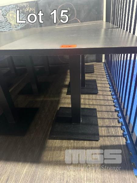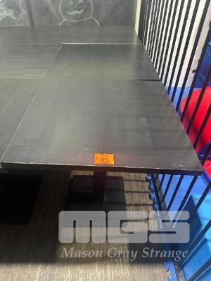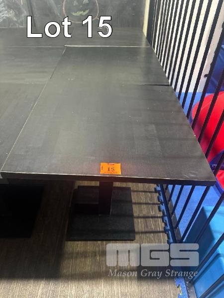 3 x SOLID TIMBER TOP CAFE TABLES, BLACK STEEL PEDESTAL BASE, 700 x 700mm