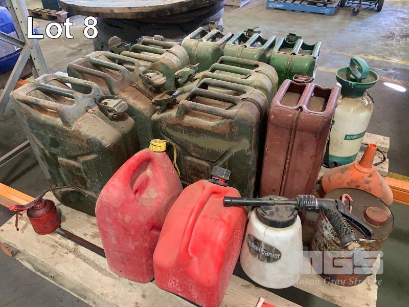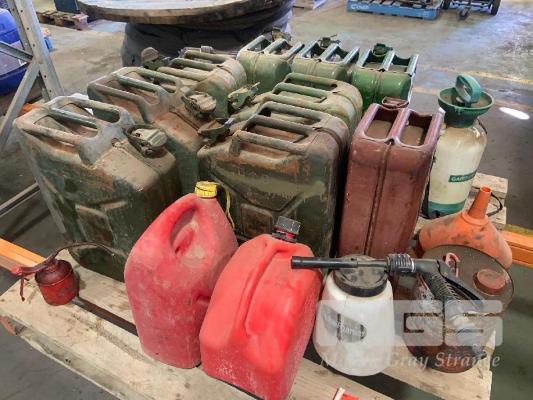 9 x STEEL JERRY CANS, 20 LITRE, 2 x FUEL CANS, RED PLASTIC, 10 LITRE, FUNNEL, 2 x HYDRA FOAM UNITS & PRESSURE SPRAY BOTTLE 1 x PALLET