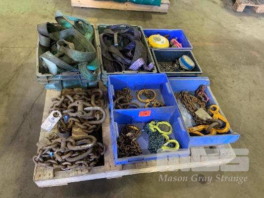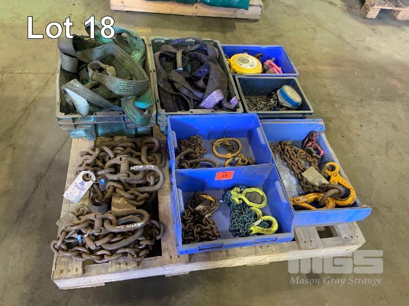 ASSORTED LIFTING SLINGS, LIFTING CHAINS, RECOIL UNIT, 15kg, CHAIN BLOCK 500kg, SPECIALTY LIFT HOOKS CONTENTS 1 x PALLET