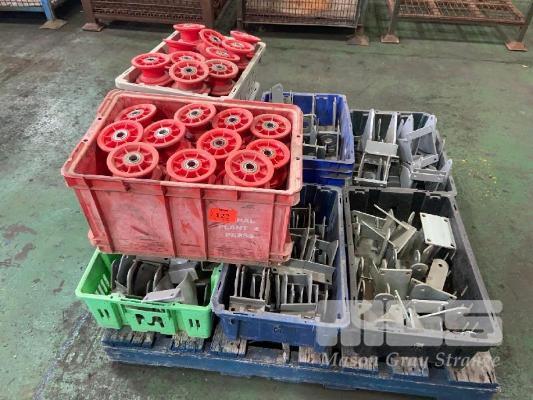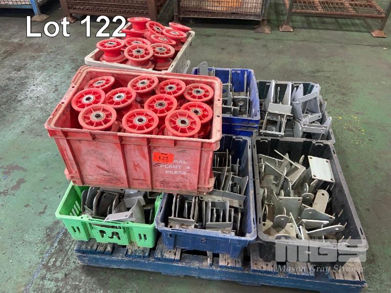 CASTOR WHEEL PARTS, NEW, 4" PLASTIC RIMS WITH BEARINGS & STEEL WHEEL STANDS, 6 TUBS CONTENTS 1 PALLET