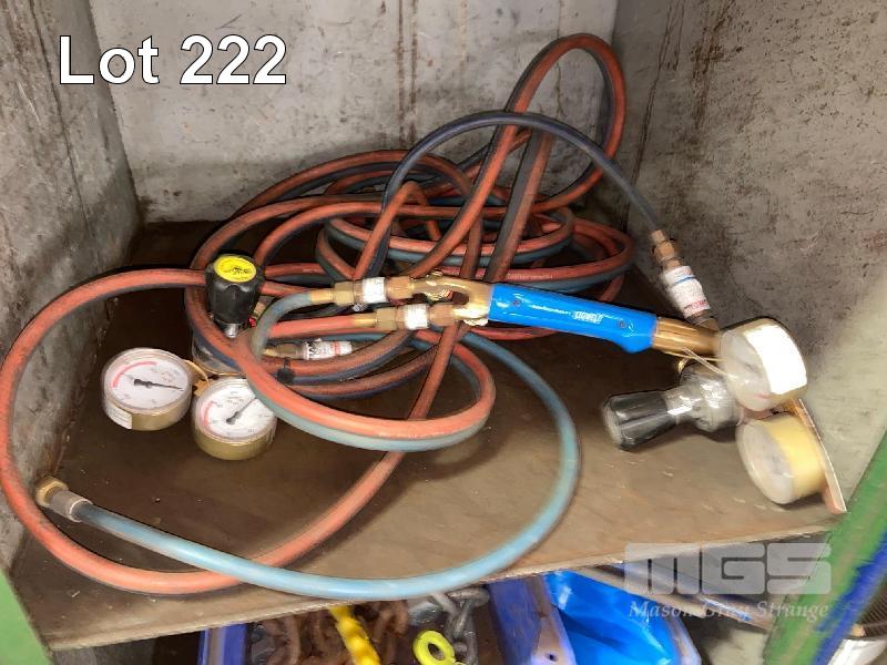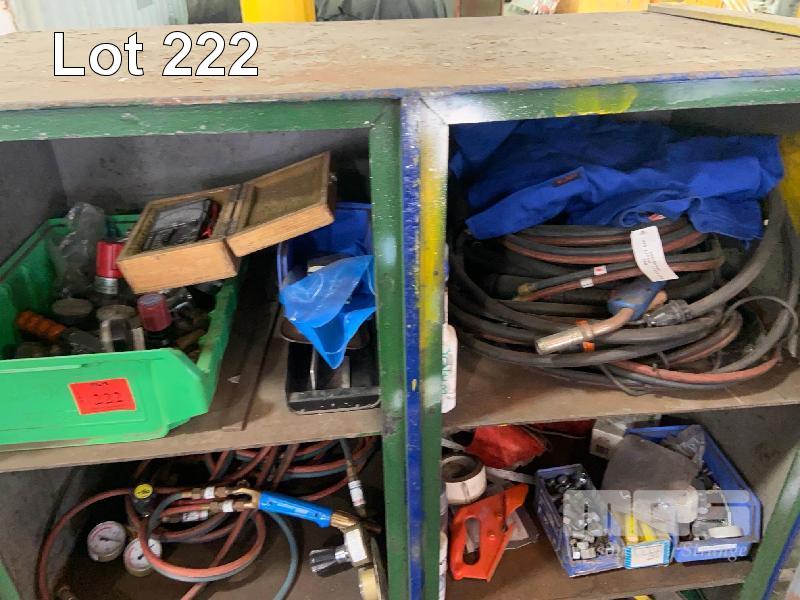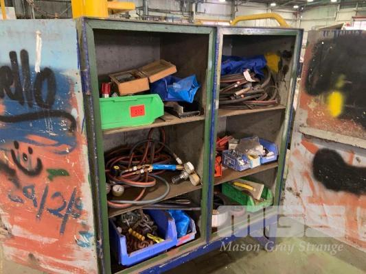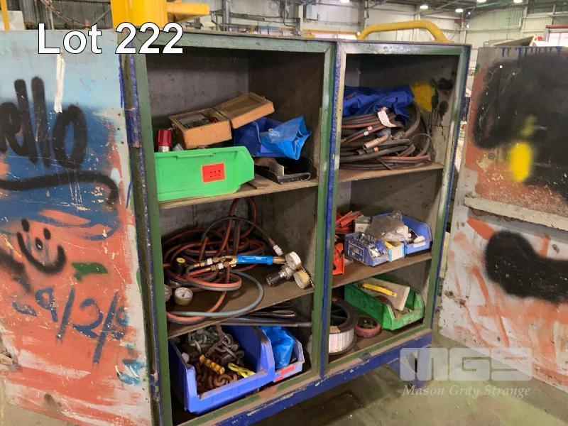 STEEL CUPBOARD & CONTENTS, 2 DOOR, OXY ACC SET, SPARE GAUGES, HOSES, MIG HAND PIECE & LINE, MIG WIRE, ETC