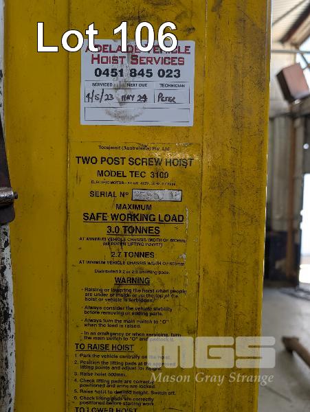2 POST VEHICLE SCREW HOIST, TECALEMIT TWIN LIFT MOD: TEC 3100 MAX LOAD: 3.0T S/N 25S5J 15 4.0kw, 415V