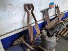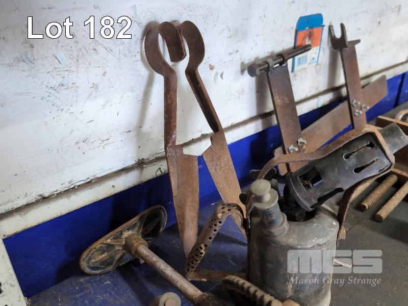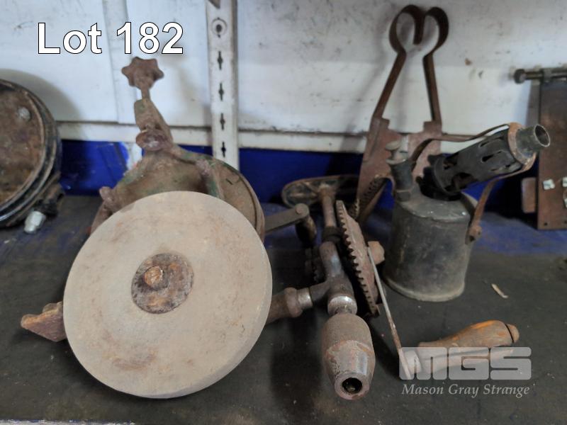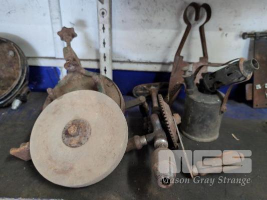 ASSORTED VINTAGE TOOLS, GRINDING STONE, BLOWTORCH, SHEARS ETC