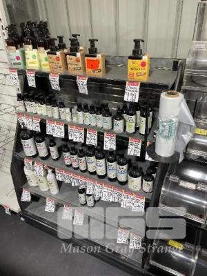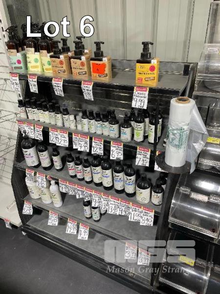 STAND, 1000 (W) x 1300mm (H), 5 TIER, MOBILE & CONTENTS INCLUDING NATURAL PRODUCTS, FACIAL SCRUBS, SHAMPOO, CONDITIONER, HAND SANITISER