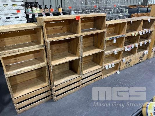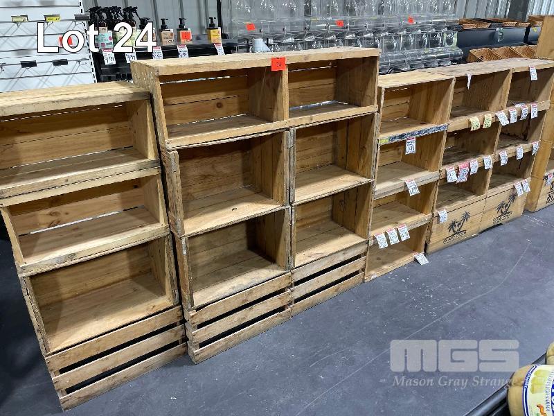 24 x TIMBER FRUIT CRATES, JOINED AS PRODUCT RACK
