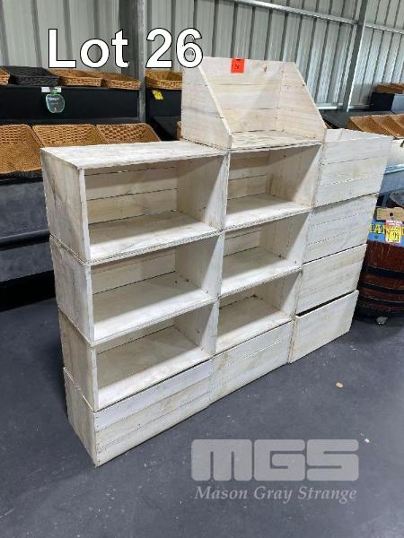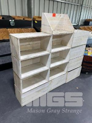 13 x WHITE PAINTED TIMBER FRUIT CRATES, USED AS DISPLAY STANDS