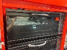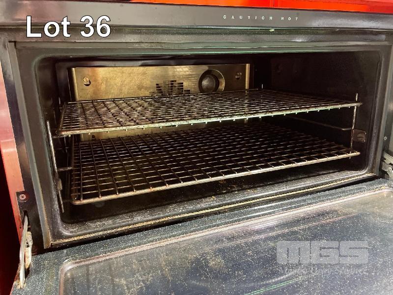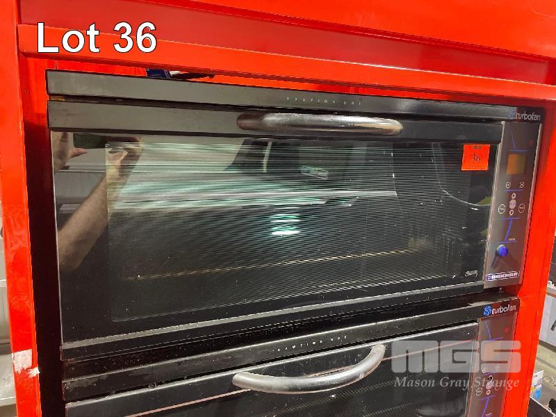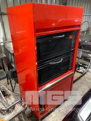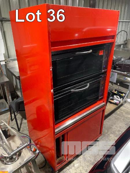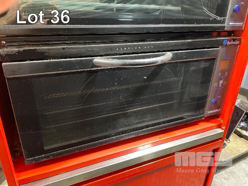 2 x TURBO FAN ELECTRIC OVENS, BAKBAR MOFFAT 240V, 15 AMP IN MOBILE CABINET, LOCKING WHEELS
