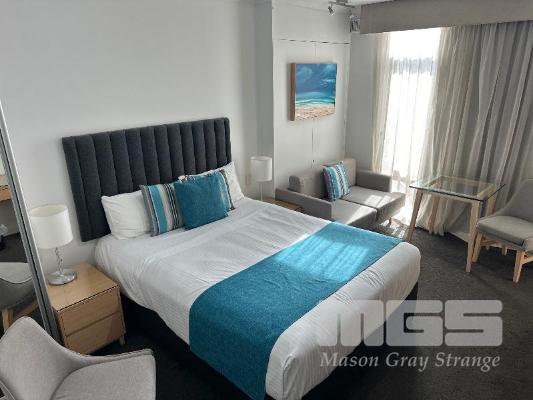 EXECUTIVE ROOM CONTENTS INCLUDING: QUEEN SIZE ENSEMBLE & HEADBOARD 2 x BEECH TIMBER BEDSIDE TABLES, 2 DRAWER, GLASS TOP 2 x TABLE LAMPS, 240V LIGHT GREY FABRIC 2 SEAT COUCH, WALL MOUNT 32" TV WITH REMOTE, BEECH TIMBER BUFFET, GLASS TOP, SQUARE DINING TABLE & 2 x LIGHT GREY FABRIC DINING CHAIRS SINGLE DRAWER DESK, GLASS TOP, 2 TIER LUGGAGE BENCH, GUARD ALL DIGITAL SAFE, WALL ART / MIRROR, MICROWAVE, KETTLE, BAR FRIDGE ROOM #5