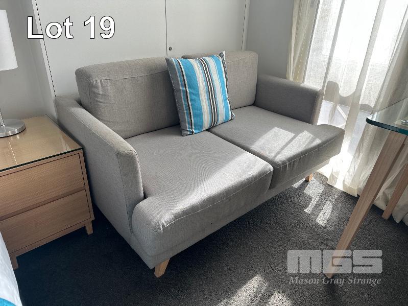 EXECUTIVE ROOM CONTENTS INCLUDING: QUEEN SIZE ENSEMBLE & HEADBOARD 2 x BEECH TIMBER BEDSIDE TABLES, 2 DRAWER, GLASS TOP 2 x TABLE LAMPS, 240V LIGHT GREY FABRIC 2 SEAT COUCH, WALL MOUNT 32" TV WITH REMOTE, BEECH TIMBER BUFFET, GLASS TOP, SQUARE DINING TABLE & 2 x LIGHT GREY FABRIC DINING CHAIRS SINGLE DRAWER DESK, GLASS TOP, 2 TIER LUGGAGE BENCH, GUARD ALL DIGITAL SAFE, WALL ART / MIRROR, MICROWAVE, KETTLE, BAR FRIDGE ROOM #28
