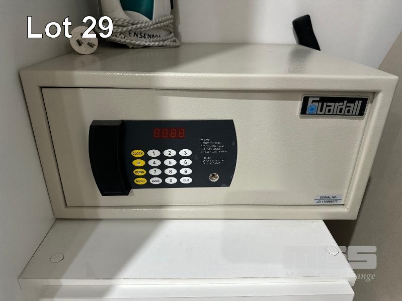 EXECUTIVE ROOM CONTENTS INCLUDING: QUEEN SIZE ENSEMBLE & HEADBOARD 2 x BEECH TIMBER BEDSIDE TABLES, 2 DRAWER, GLASS TOP 2 x TABLE LAMPS, 240V LIGHT GREY FABRIC 2 SEAT COUCH, WALL MOUNT 32" TV WITH REMOTE, BEECH TIMBER BUFFET, GLASS TOP, SQUARE DINING TABLE & 2 x LIGHT GREY FABRIC DINING CHAIRS SINGLE DRAWER DESK, GLASS TOP, 2 TIER LUGGAGE BENCH, GUARD ALL DIGITAL SAFE, WALL ART / MIRROR, MICROWAVE, KETTLE, BAR FRIDGE ROOM #16