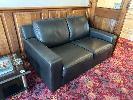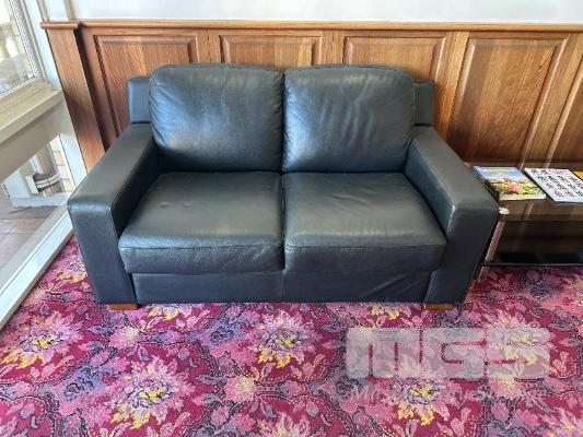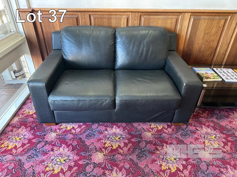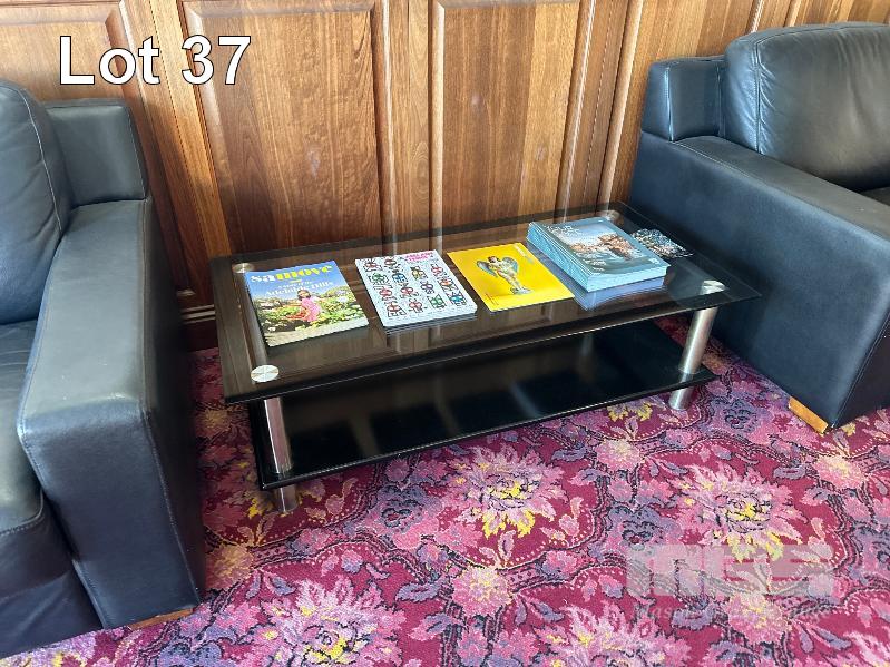 2 x 2 SEAT BLACK VINYL SOFAS, 2 TIER GLASS COFFEE TABLE, 1200 x 600mm