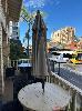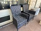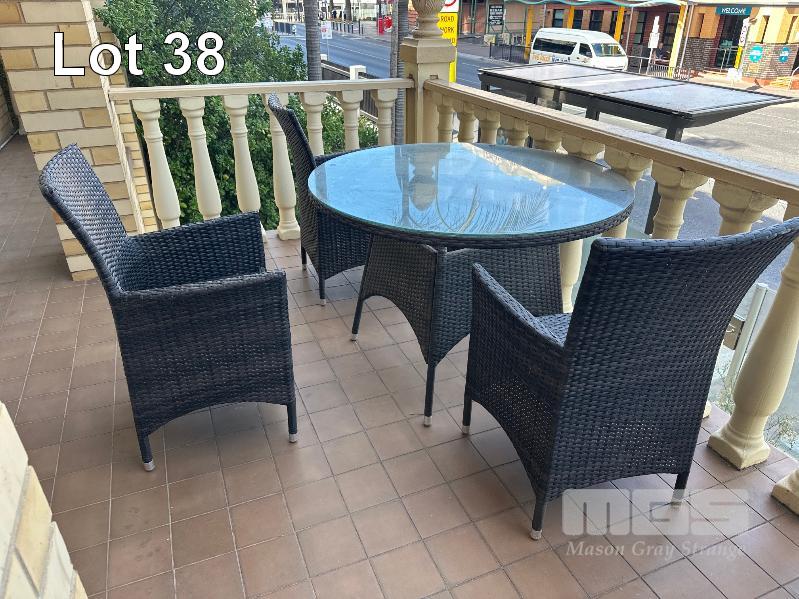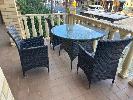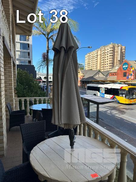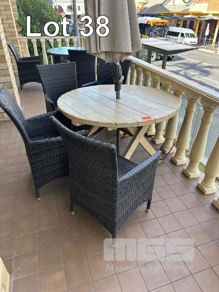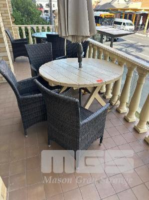 9 x OUTDOOR WICKER CHAIRS, TIMBER CIRCULAR TABLE WITH UMBRELLA, (NO BASE), CIRCULAR GLASS TOP TABLE
