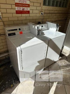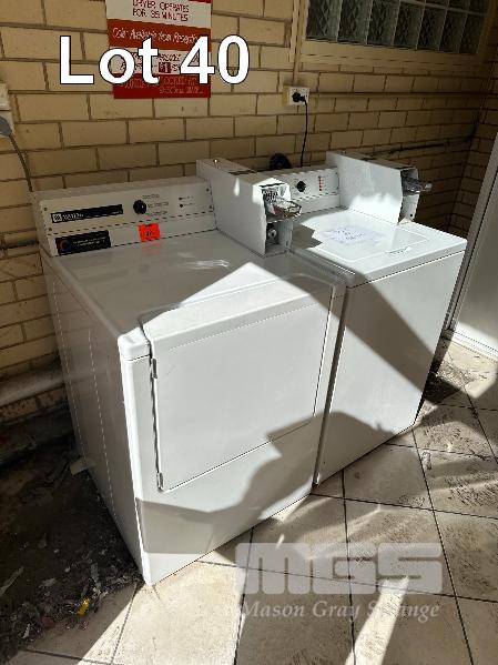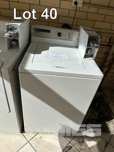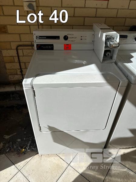 MAYTAG COMMERCIAL DRYER, COIN OP, WITH KEY, (NEEDS REPAIR) MAYTAG COMMERCIAL WASHING MACHINE, COIN OP, WITH KEY (NEEDS REPAIR)