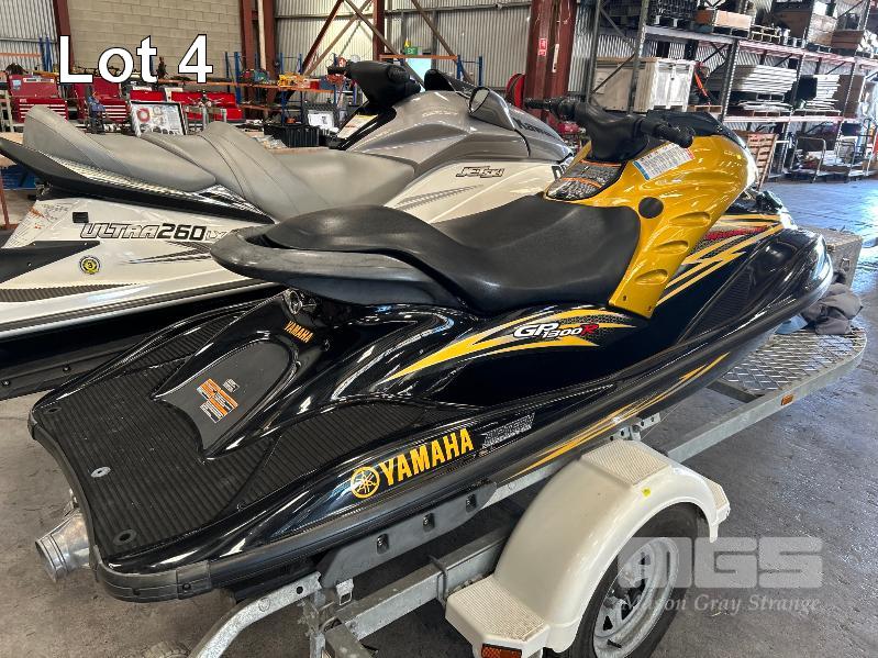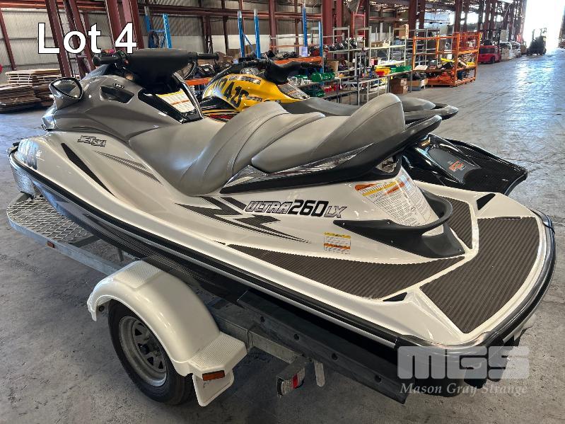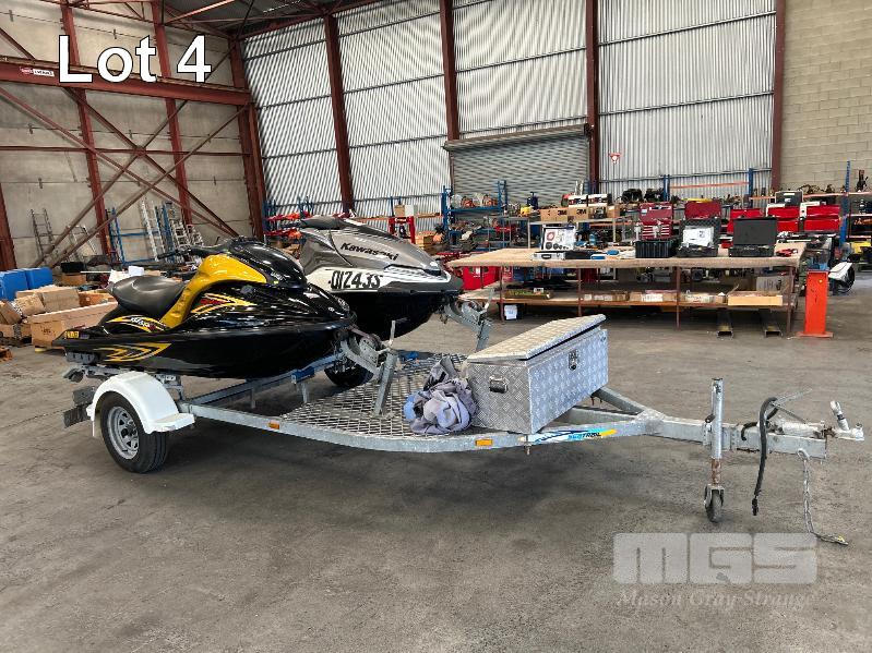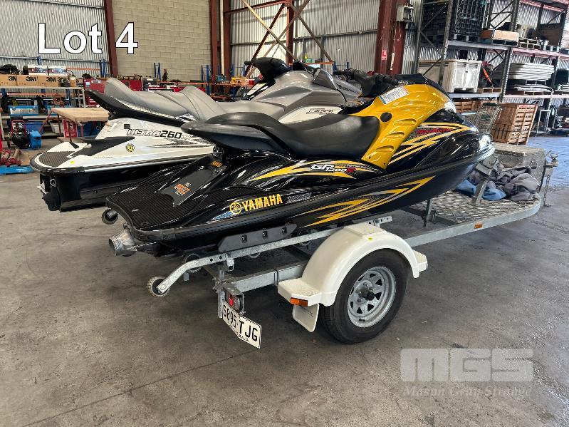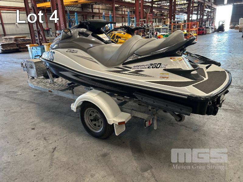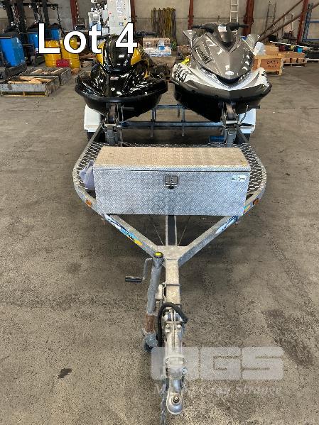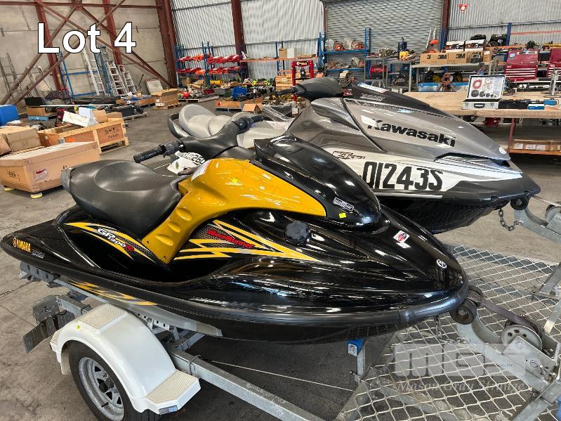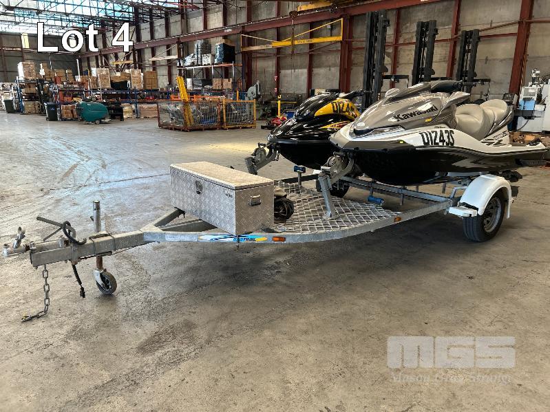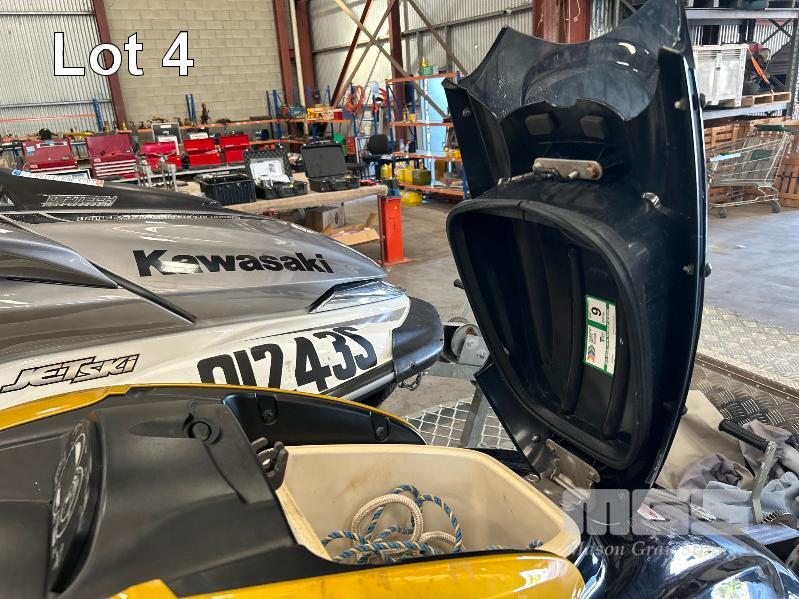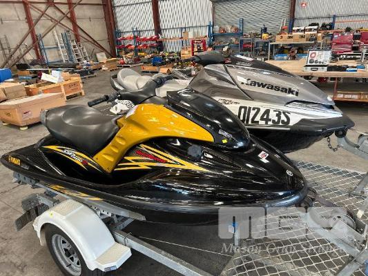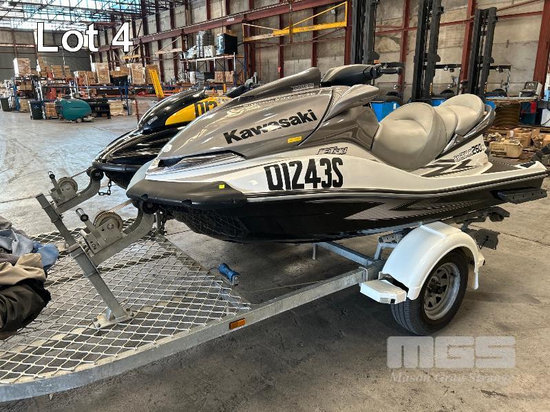 2 x JET SKIS & TRAILER PACKAGE INCLUDING: 2006 YAMAHA GP1300R WAVERUNNER S/NO: F1G816326 POWERED BY 1.3 LITRE, 3 CYLINDER, 2 STROKE, DIP TECH ENGINGE HOURS: 139 SHOWING & 2008 KAWASAKI, ULTRA 260LX, JET SKI S/NO: KAW90185K809 POWERED BY 4 CYLINDER SUPERCHARGED, INTERCOOLED, DIP TECH ENGINE, HOURS: 72 SHOWING WITH REVERSE THRUST , 2 x POWER CONTROL KEYS, 1 x HIGH & 1 x LOW INC. 2018 AUSMARINE DUAL JET SKI TRAILER, SINGLE AXLE MOD: DBL-PWC SEA TRAIL REG: S895 TJG (SA) VIN: 6KUAUSMARJRBT0246 GALV STEEL, BALL HITCH, FITTED WITH FRONT MOUNT ALLOY TOOLBOX, JOCKEY WHEEL, BRAKES, 2 x MANUAL WINCHES, 2 x COVERS TO SUIT JET SKIS, JERRY CANS & TOOLS BAG ACCESSORIES IN OFFICE