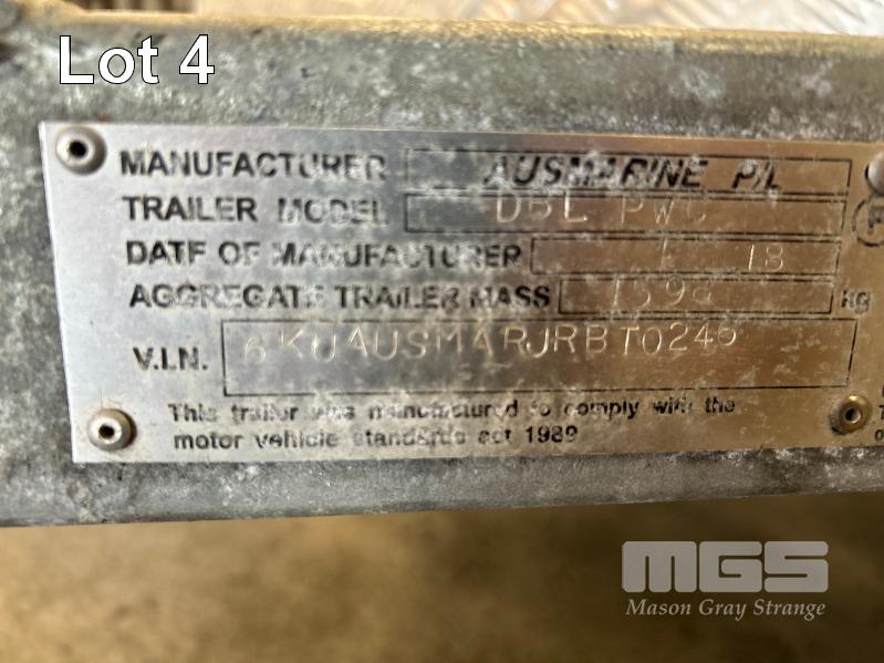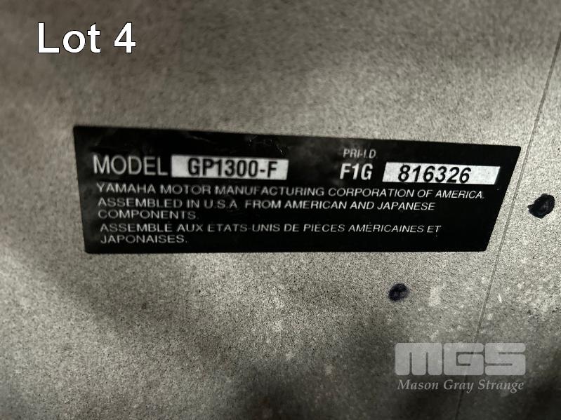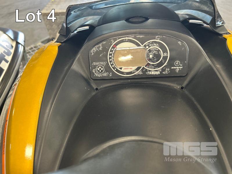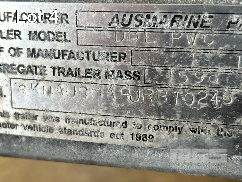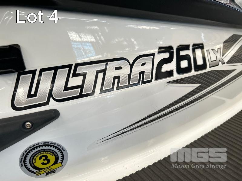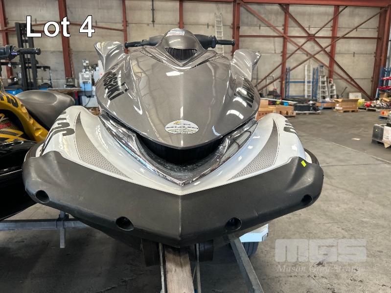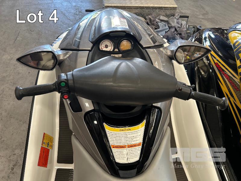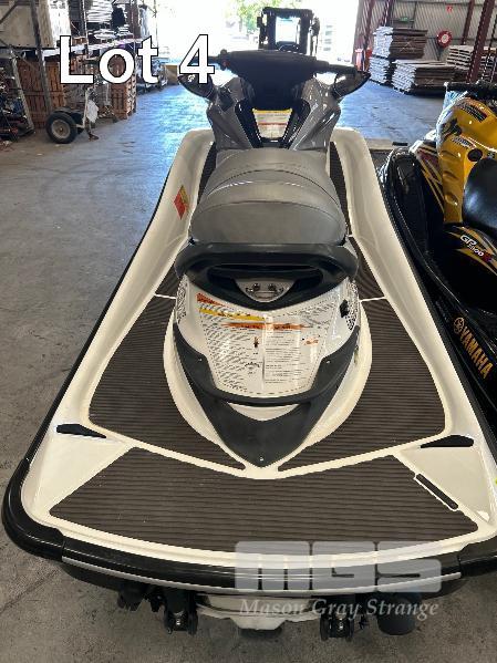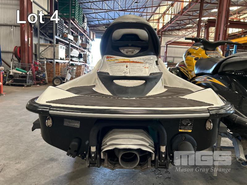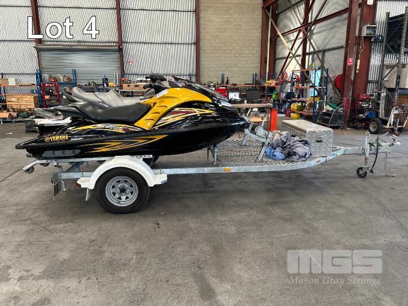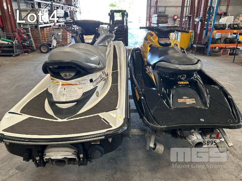 2 x JET SKIS & TRAILER PACKAGE INCLUDING: 2006 YAMAHA GP1300R WAVERUNNER S/NO: F1G816326 POWERED BY 1.3 LITRE, 3 CYLINDER, 2 STROKE, DIP TECH ENGINGE HOURS: 139 SHOWING & 2008 KAWASAKI, ULTRA 260LX, JET SKI S/NO: KAW90185K809 POWERED BY 4 CYLINDER SUPERCHARGED, INTERCOOLED, DIP TECH ENGINE, HOURS: 72 SHOWING WITH REVERSE THRUST , 2 x POWER CONTROL KEYS, 1 x HIGH & 1 x LOW INC. 2018 AUSMARINE DUAL JET SKI TRAILER, SINGLE AXLE MOD: DBL-PWC SEA TRAIL REG: S895 TJG (SA) VIN: 6KUAUSMARJRBT0246 GALV STEEL, BALL HITCH, FITTED WITH FRONT MOUNT ALLOY TOOLBOX, JOCKEY WHEEL, BRAKES, 2 x MANUAL WINCHES, 2 x COVERS TO SUIT JET SKIS, JERRY CANS & TOOLS BAG ACCESSORIES IN OFFICE