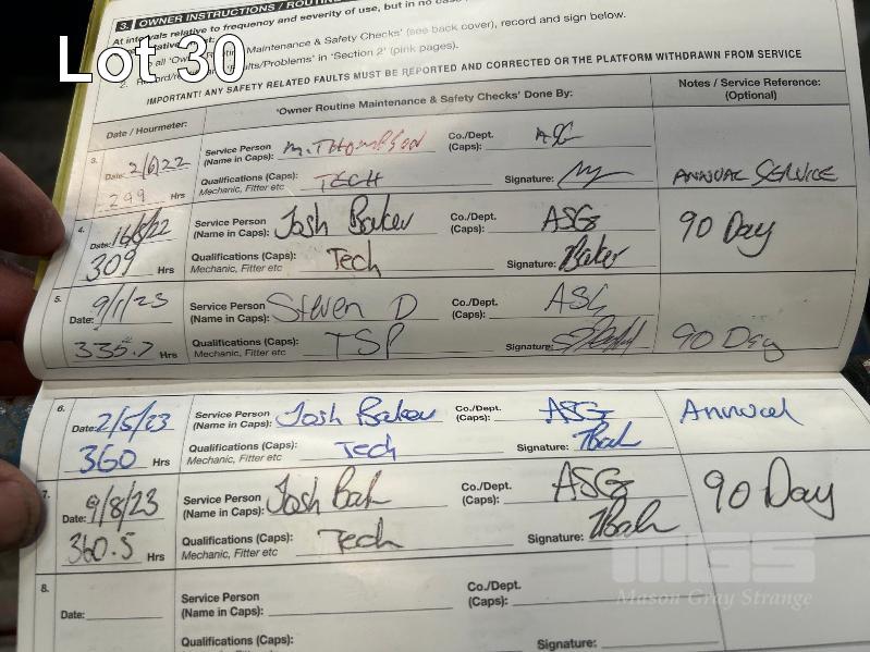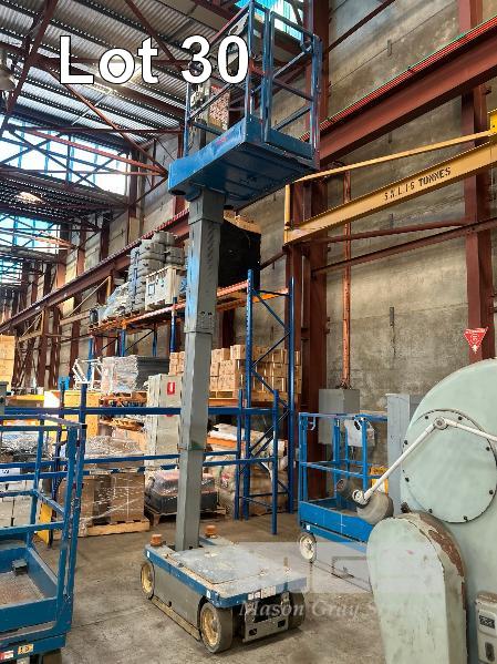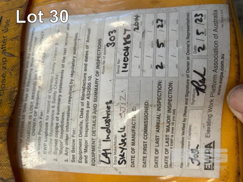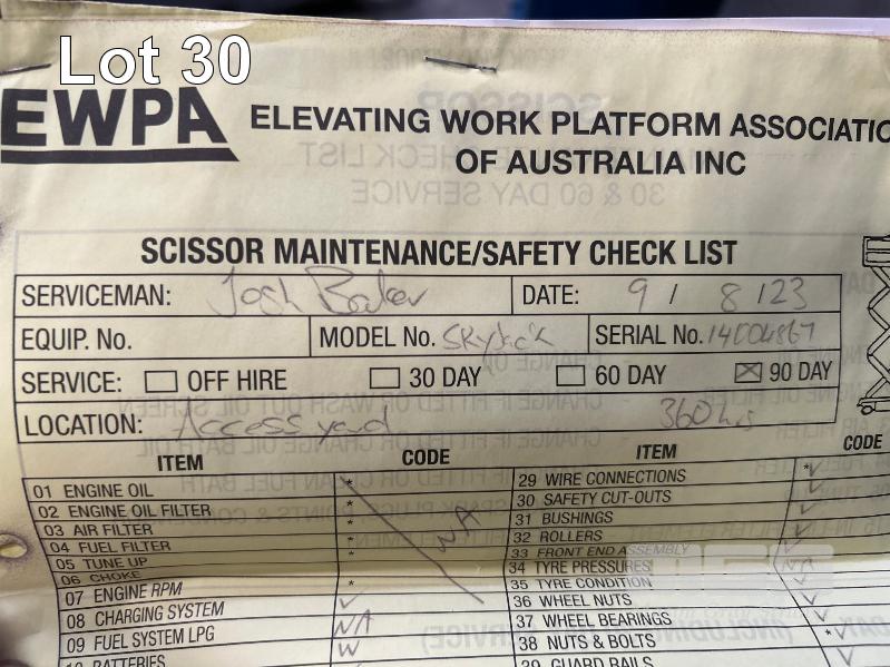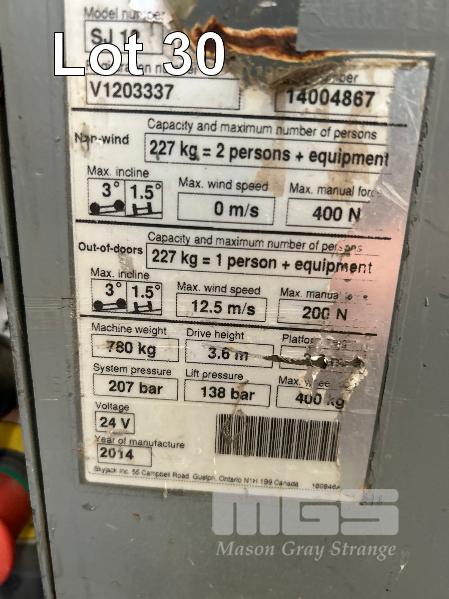 ELEVATING WORK PLATFORM LIFT, SKY JACK MOD: SJ12 2 PERSON ELECTRIC BUILT IN CHARGER, 240V HOURS: 422 SHOWING SERIAL No.14004867 MAX LIFT HEIGHT: 3600mm MAX CAPACITY: 227kg WEIGHT: 780kg NOTE: PLATFORM LIFT CONTROLS NOT OPERATIONAL