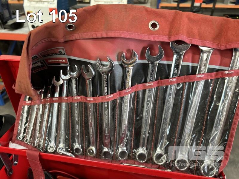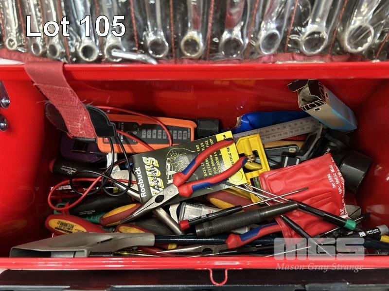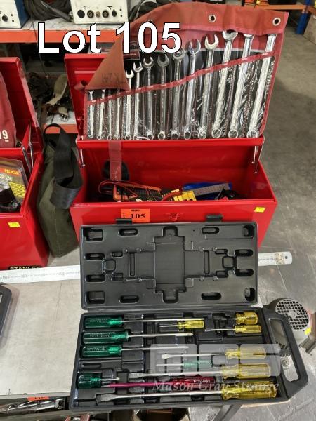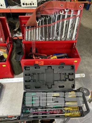 TOOL BOX & ASSORTED HAND TOOLS INCLUDING SIDCHROME COMBO SPANNER SET, 10 TO 19mm, DRIVER SET, PLIERS, ALLEN KEYS, ETC