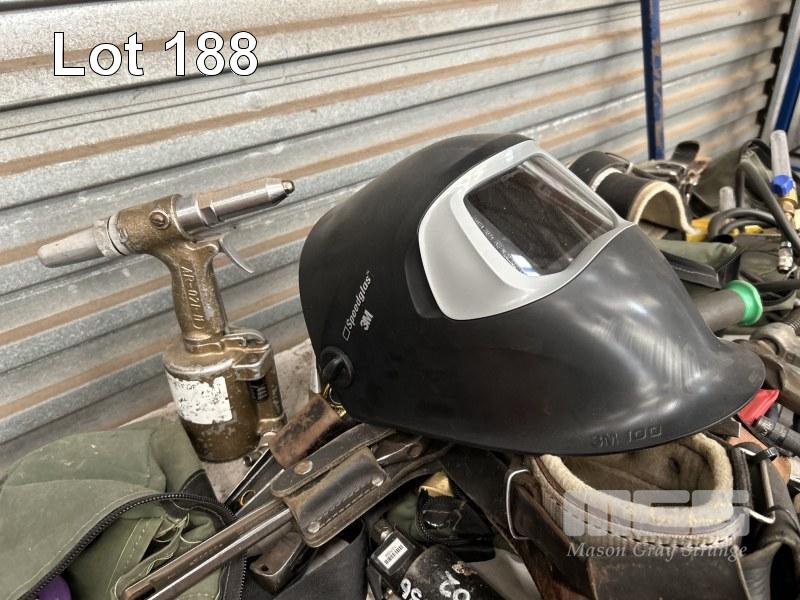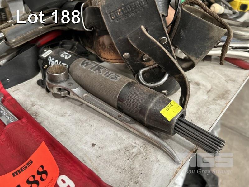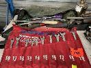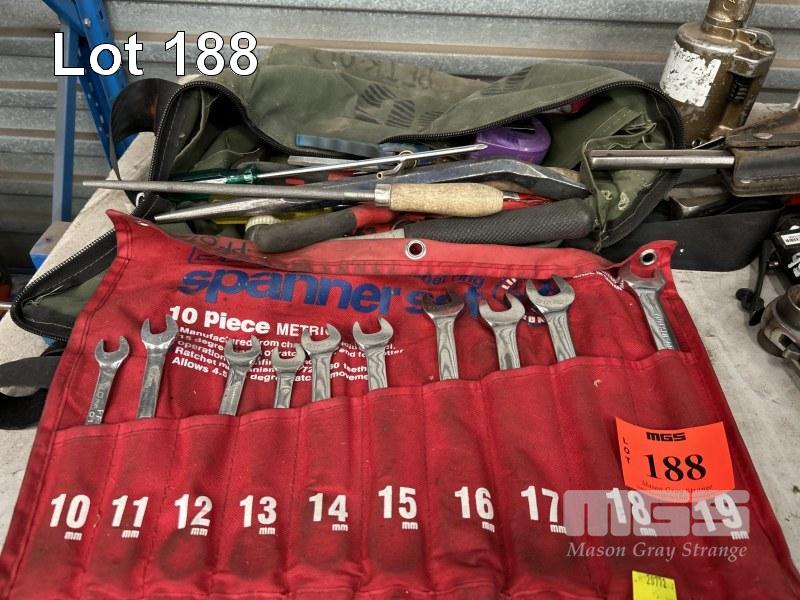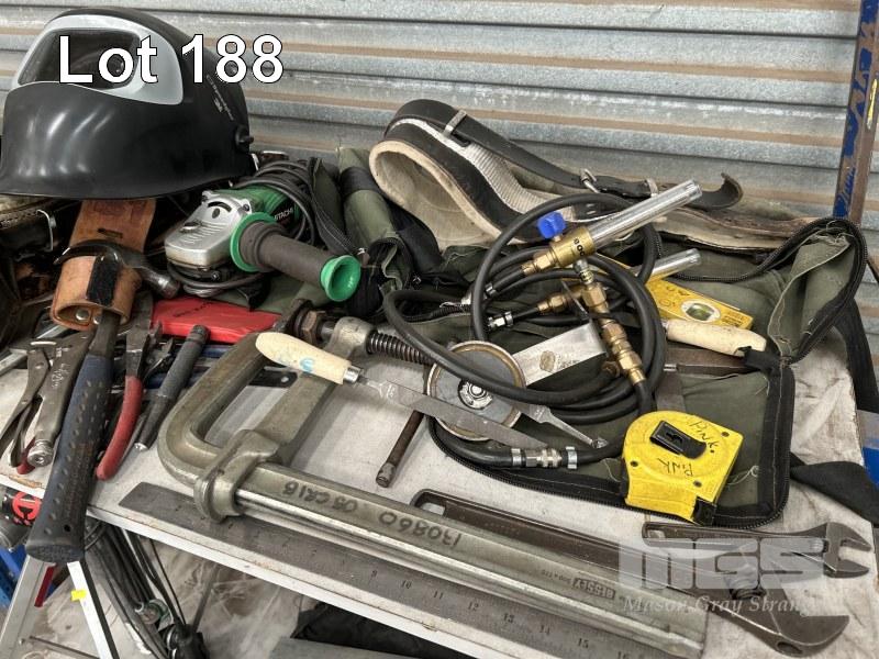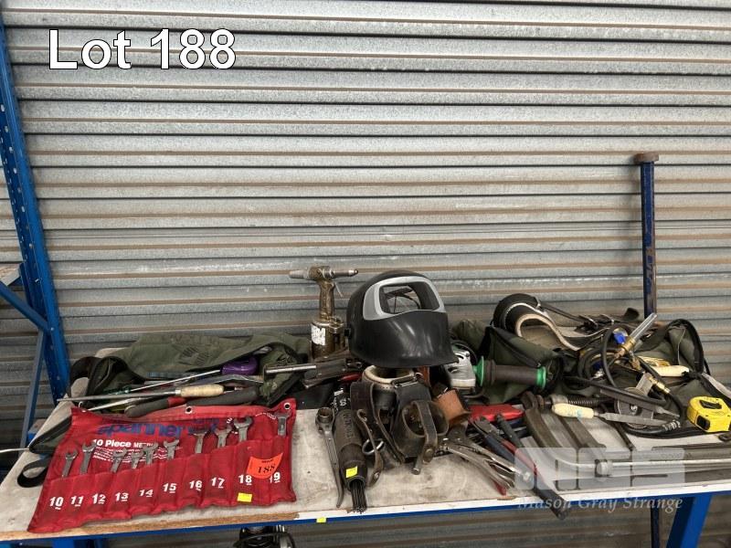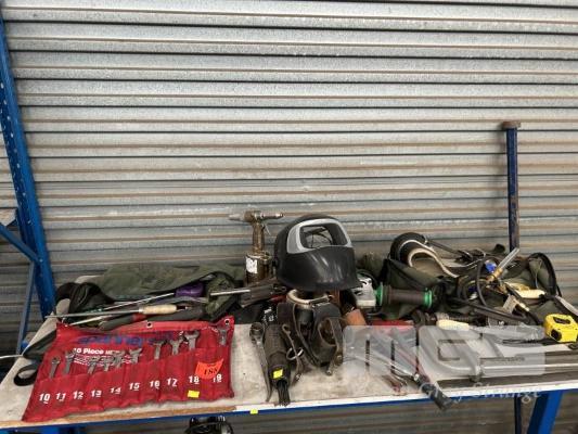 QUANTITY HAND TOOLS INCLUDING SPANNER SET, SLAMPS, VICE GRIPS, SHIFTERS, TOOL BELTS, HITACHI ANGLE GRINDER, 240V, PNEUMATIC RIVET GUN & DESCALER