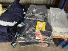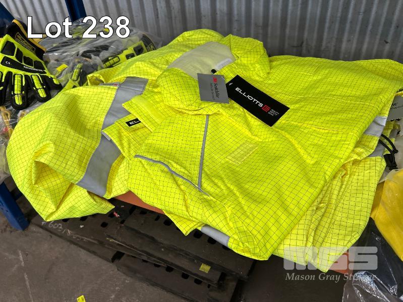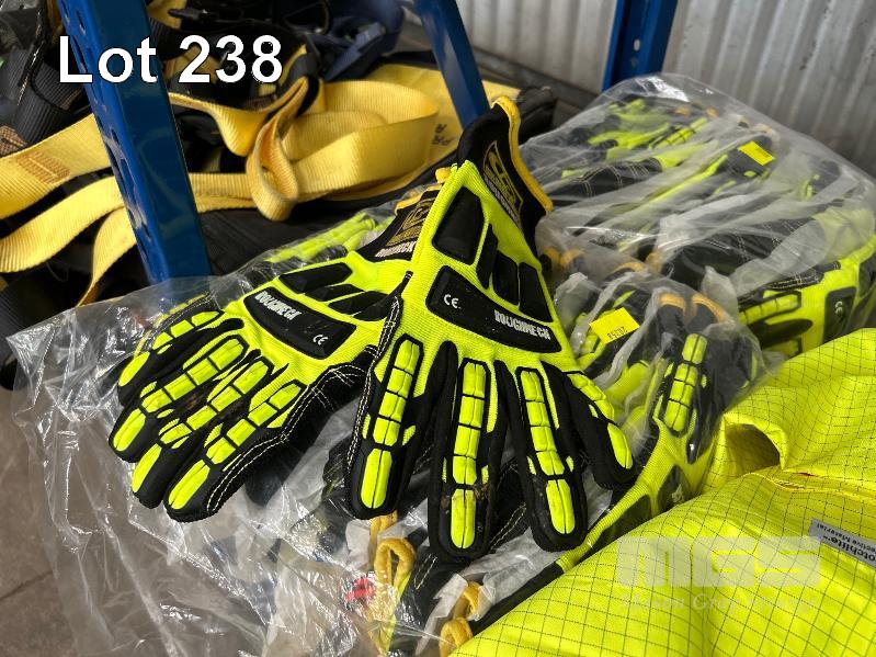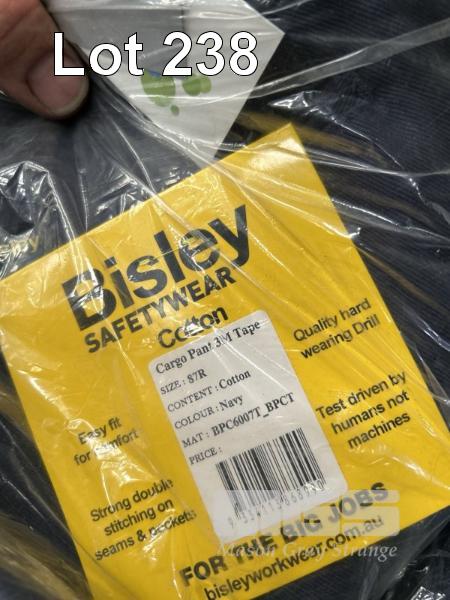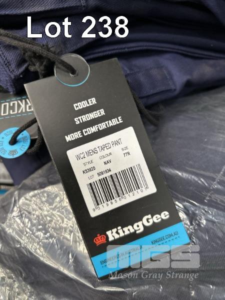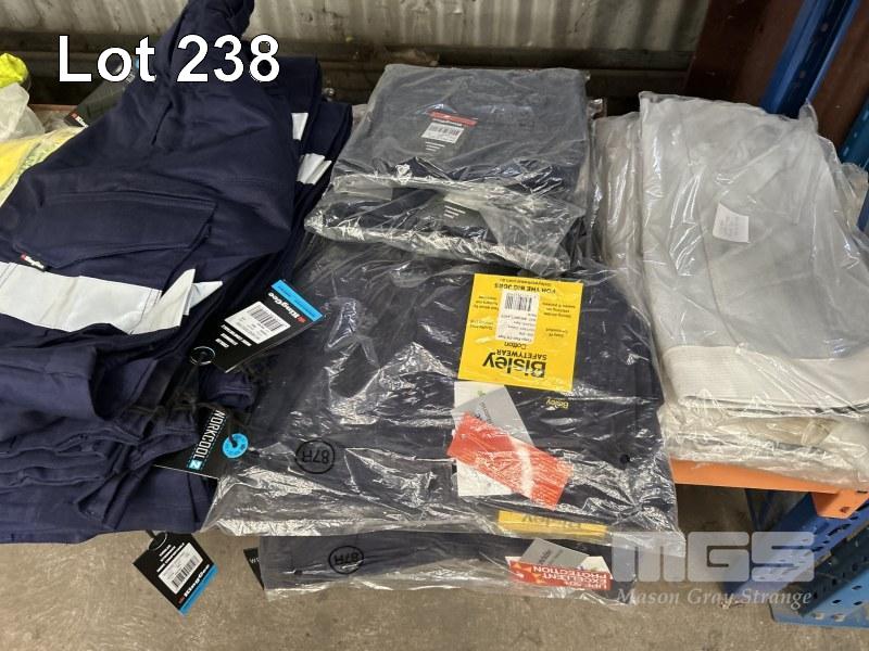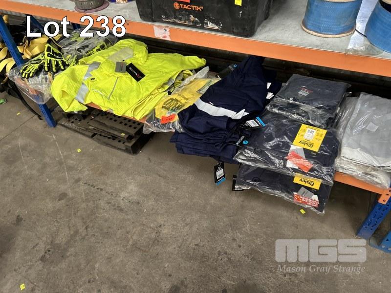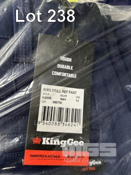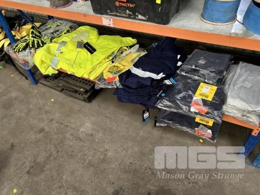 WORK PANTS, NAVY BLUE, 2 x PAIRS KINGGEE, WMS DRILL, SIZE 12, 2 x PAIRS BISLEY CARGO, SIZE: 87R, 6 x PAIRS KING GEE WC2, SIZE: 77R WET WEATHER HIGH VIS, INC. 2 x JACKETS ELLIOTTS 3M 3 x PAIRS PANTS, SIZE: L 20 x PAIRS WORK GLOVES, HIGH VIS, ROUGHNECK RINGERS, ARMOURED KNUCKLES 1 x SHELF