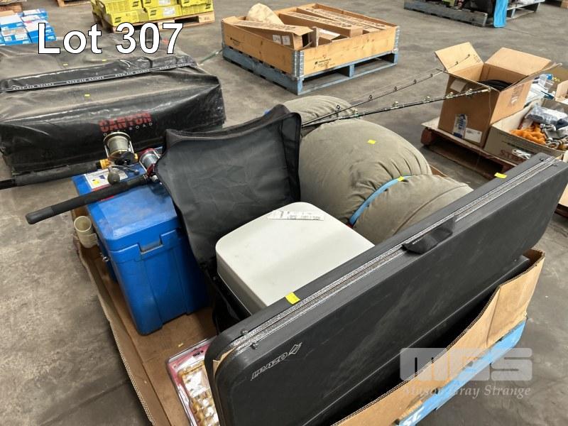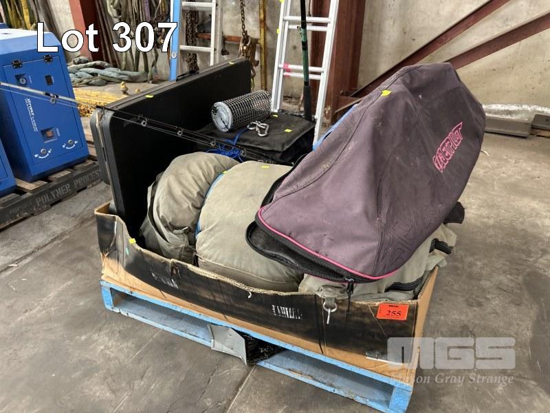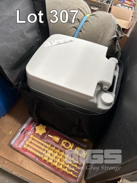 CAMPING EQUIPMENT INCLUDING SWAG, PORTABLE TOILET, POLY ESKY, FOLDING TABLE, 2 x FISHING RODS & WAKEBOARD