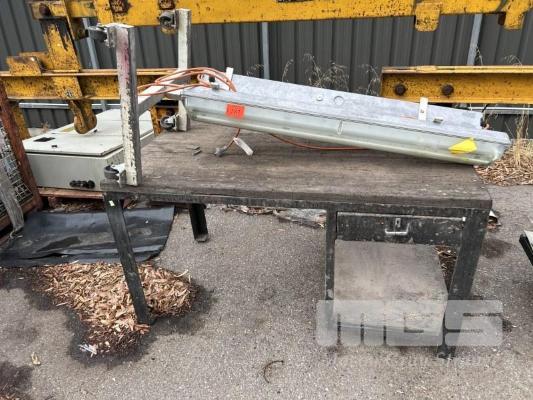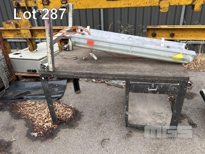 STEEL WORK BENCH, 1500 x 830 x 820mm, TIMBER TOP, 2 x WORK LIGHTS ON STEEL FRAME WITH CASTORS