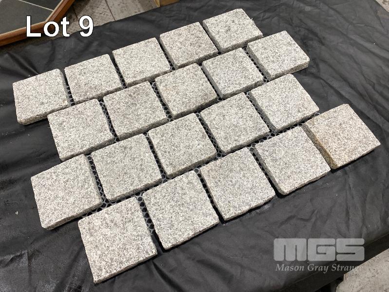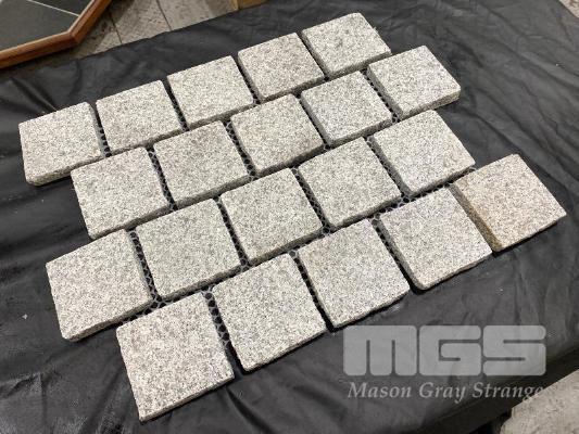 COBBLE STONES, LIGHT GREY GRANITE, 22.98m2 TOTAL, SHEET SIZE: 540 x 430 x 20mm, STONE SIZE: 100 x 100 x 20mm, PACKAGED IN TIMBER CRATE