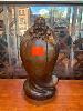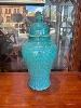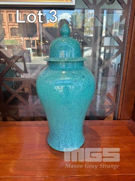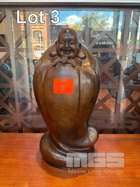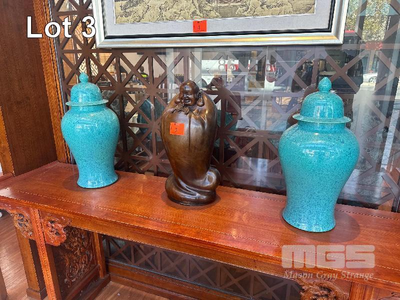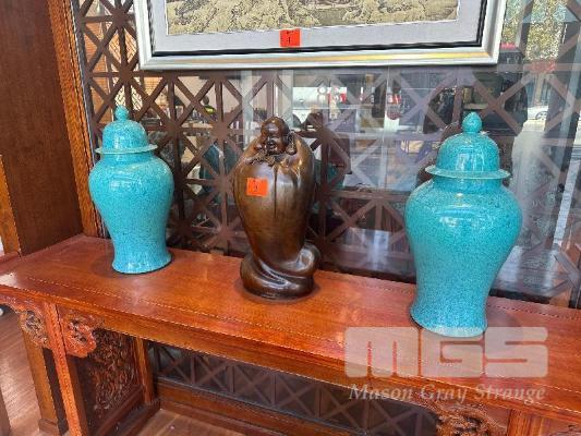 2 x PORCELAIN ORNATE URNS, LIGHT BLUE, 600mm (H) & TIMBER BUDDHA STATUE, 600mm (H)