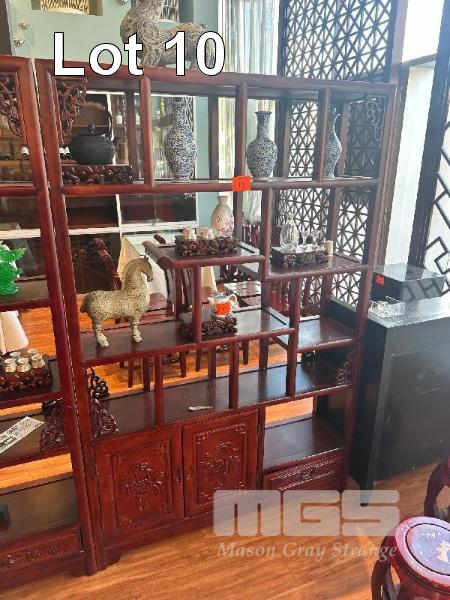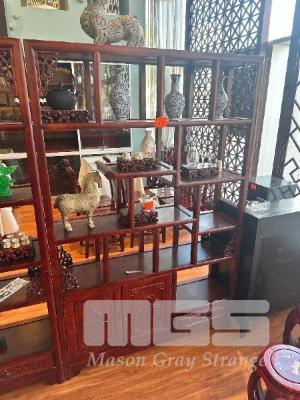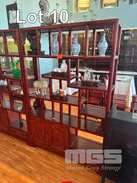 ORNATE RED TIMBER SHELVING UNIT, 1300 x 320 x 1970mm (H)