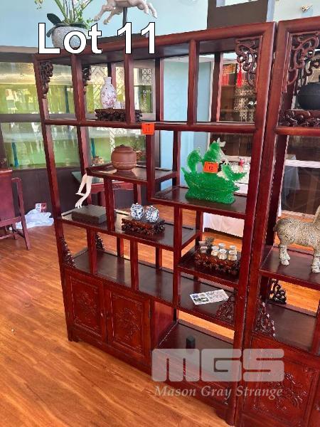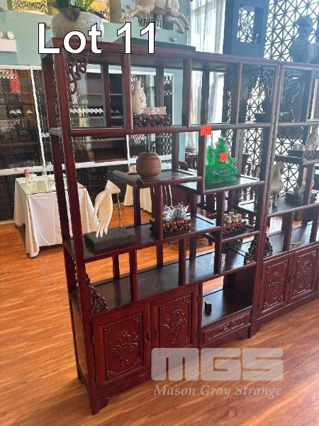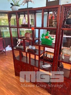 ORNATE RED TIMBER SHELVING UNIT, 1300 x 320 x 1970mm (H) (NO CONTENTS)