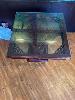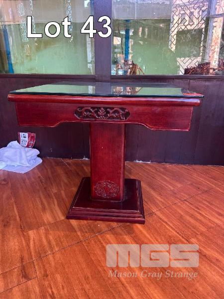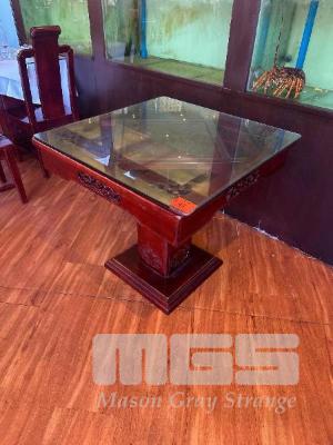 2 x ORIENTAL RED SOLID TIMBER GLASS TOP TABLES, 800 x 800mm