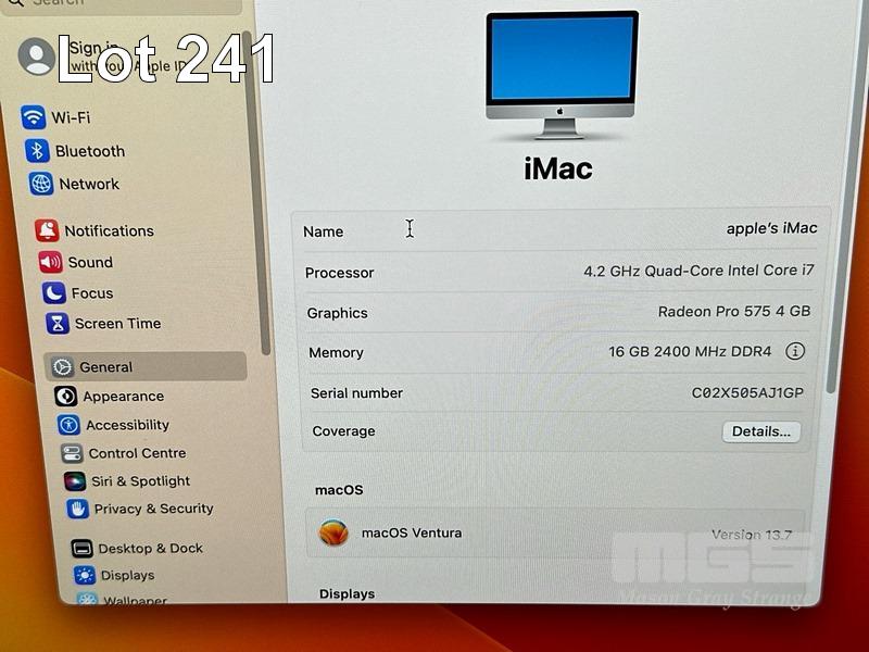 APPLE iMAC (A1419), CORE i7 7700K (7TH GEN) @ 4.2GHz, 16GB DDR4 RAM, 256GB SSD, BUILT-IN 27" RETINA 5K DISPLAY (5120x2880), 4GB RADEON PRO 575 VIDEO, Wi-Fi, BLUETOOTH, MAC OS 13 INSTALLED, MACALLY KEYBOARD & MOUSE S/N:C02X505AJ1GP