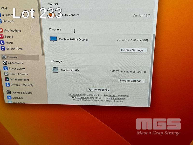 APPLE iMAC (A1419), CORE i7 7700K (7TH GEN) @ 4.2GHz, 16GB DDR4 RAM, 1TB FUSION DRIVE, BUILT-IN 27" RETINA 5K DISPLAY (5120x2880), 4GB RADEON PRO 575 VIDEO, Wi-Fi, BLUETOOTH, MAC OS 13 INSTALLED (NO KEYBOARD, NO MOUSE) S/N:C02VP00GJ1GP
