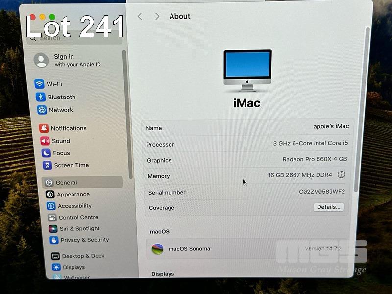 APPLE iMAC (A2116), CORE i5 8500 (8TH GEN) @ 3GHz, 16GB DDR4 RAM, 512GB SSD, BUILT-IN 21.5" RETINA DISPLAY (4096x2304), 4GB RADEON PRO 560X VIDEO, Wi-Fi, BLUETOOTH, MAC OS 14 INSTALLED, SATECHI KEYBOARD & MICROSOFT COMFORT 4500 MOUSE S/N:C02ZV058JWF2