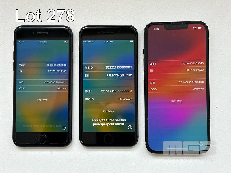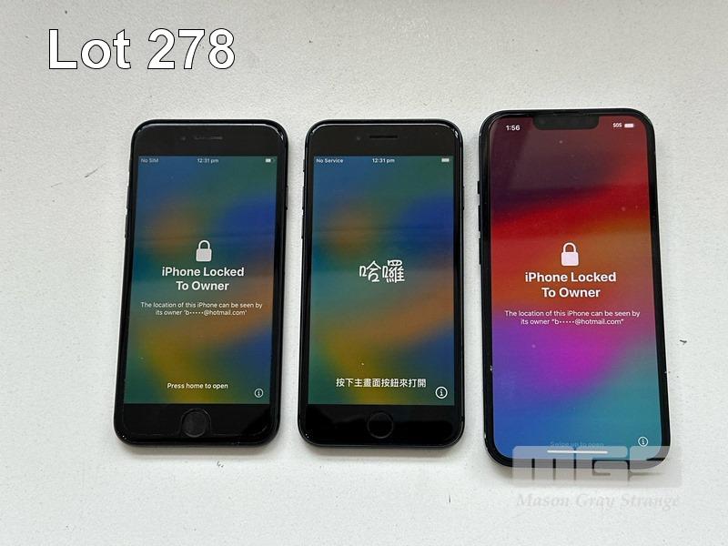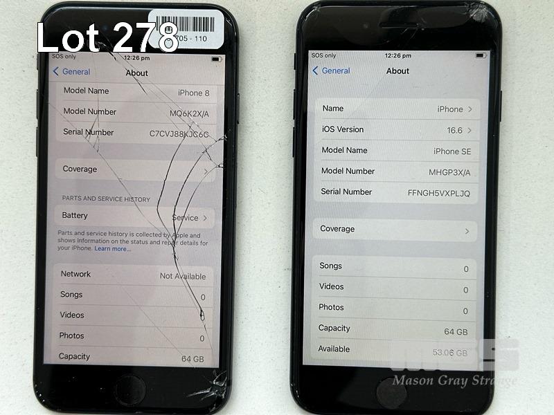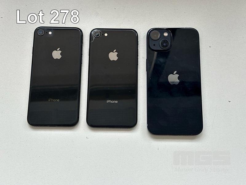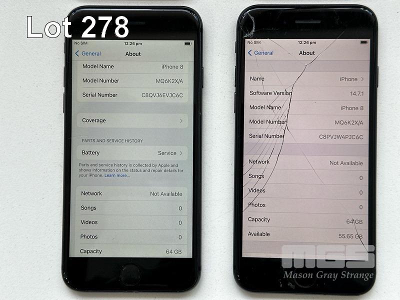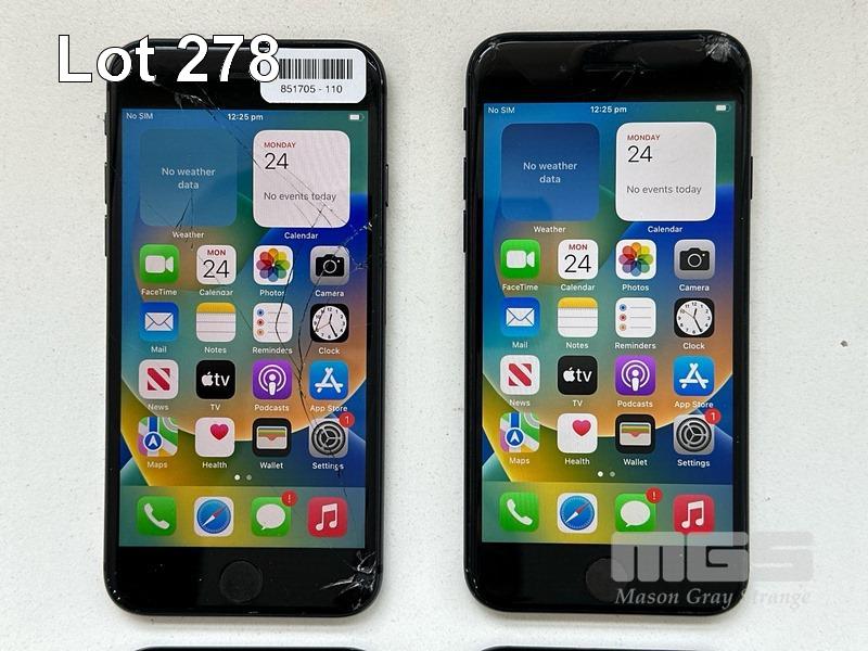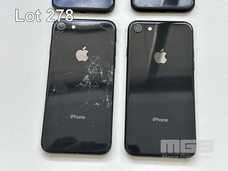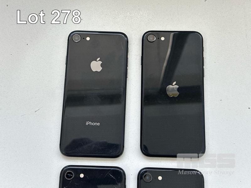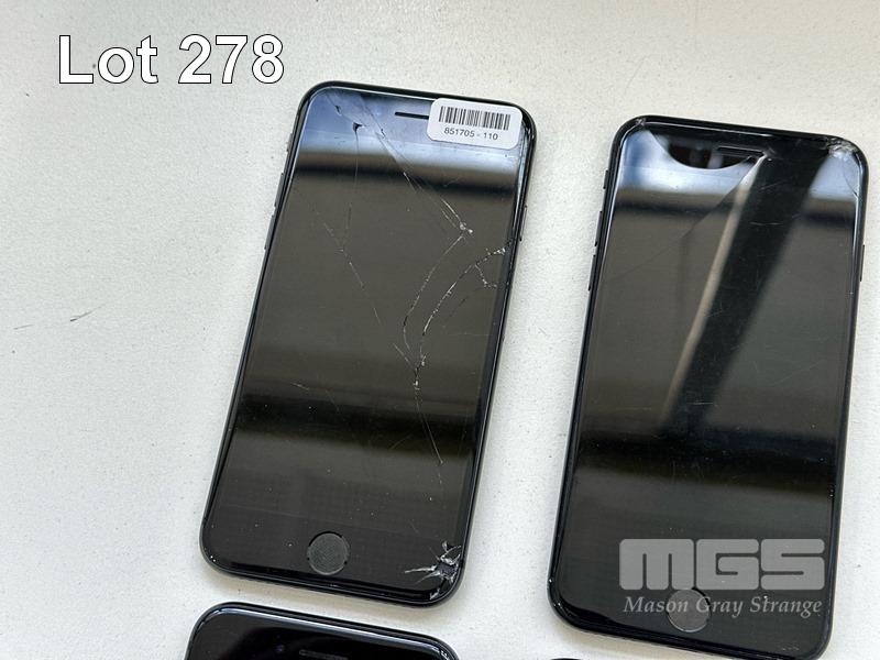 7 x APPLE iPHONES INC. - APPLE iPHONE 8, 64GB, SPACE GREY, MODEL MQ6K2X/A (DAMAGED, BATTERY SERVICE MESSAGE) - APPLE iPHONE SE, 64GB, BLACK, MODEL MHGP3X/A (DAMAGED) - APPLE iPHONE 8, 64GB, SPACE GREY, MODEL MQ6K2X/A (DAMAGED, BATTERY SERVICE MESSAGE) - APPLE iPHONE 8, 64GB, SPACE GREY, MODEL MQ6K2X/A (DAMAGED) - APPLE iPHONE 8, 64GB, SPACE GREY, MODEL MQ6K2X/A (LOCKED TO iCLOUD) - APPLE iPHONE 8, 64GB, SPACE GREY, MODEL MQ6K2X/A (LOCKED TO iCLOUD, DAMAGED) - APPLE iPHONE 13, 256GB, MIDNIGHT, MODEL MLQ63X/A (LOCKED TO iCLOUD) (NO CABLES, NO CHARGERS) S/N:C7CVJ88KJC6C, FFNGH5VXPLJQ, C8QVJ6EVJC6C, C8PVJW4PJC6C, C7CW1HVDJC6C, FFMYXHQ6JC6C, KLHC4H40QD