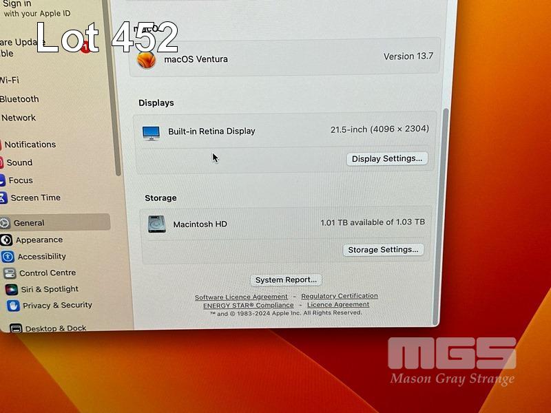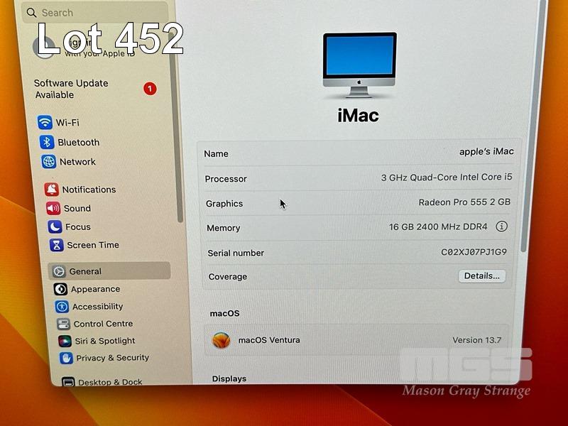 APPLE iMAC (A1418), CORE i5 7400 (7TH GEN) @ 3GHz, 16GB DDR4 RAM, 1TB FUSION DRIVE, BUILT-IN 21.5" RETINA DISPLAY (4096x2304), 2GB RADEON PRO 555 VIDEO, Wi-Fi, BLUETOOTH, MAC OS 13 INSTALLED (NO KEYBOARD, NO MOUSE, NO CABLE) S/N:C02XJ07PJ1G9