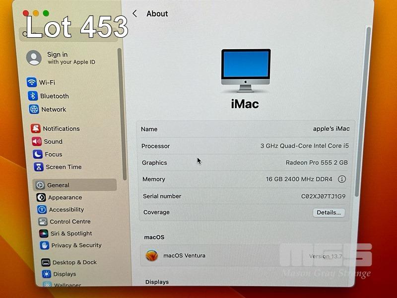 APPLE iMAC (A1418), CORE i5 7400 (7TH GEN) @ 3GHz, 16GB DDR4 RAM, 1TB FUSION DRIVE, BUILT-IN 21.5" RETINA DISPLAY (4096x2304), 2GB RADEON PRO 555 VIDEO, Wi-Fi, BLUETOOTH, MAC OS 13 INSTALLED (NO KEYBOARD, NO MOUSE, NO CABLE) S/N:C02XJ07TJ1G9