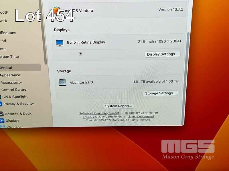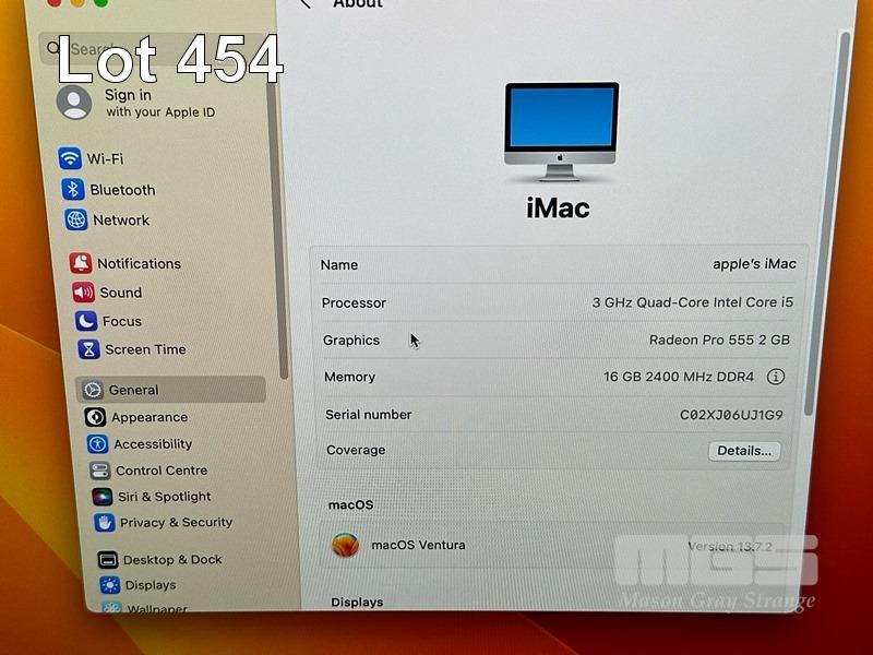 APPLE iMAC (A1418), CORE i5 7400 (7TH GEN) @ 3GHz, 16GB DDR4 RAM, 1TB FUSION DRIVE, BUILT-IN 21.5" RETINA DISPLAY (4096x2304), 2GB RADEON PRO 555 VIDEO, Wi-Fi, BLUETOOTH, MAC OS 13 INSTALLED (NO KEYBOARD, NO MOUSE, NO CABLE) S/N:C02XJ06UJ1G9