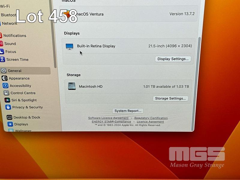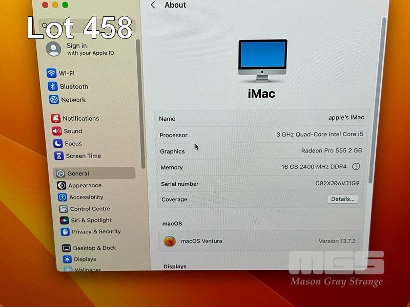 APPLE iMAC (A1418), CORE i5 7400 (7TH GEN) @ 3GHz, 16GB DDR4 RAM, 1TB FUSION DRIVE, BUILT-IN 21.5" RETINA DISPLAY (4096x2304), 2GB RADEON PRO 555 VIDEO, Wi-Fi, BLUETOOTH, MAC OS 13 INSTALLED (NO KEYBOARD, NO MOUSE, NO CABLE) S/N:C02XJ06VJ1G9