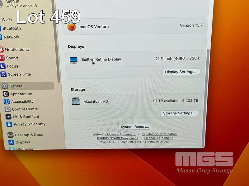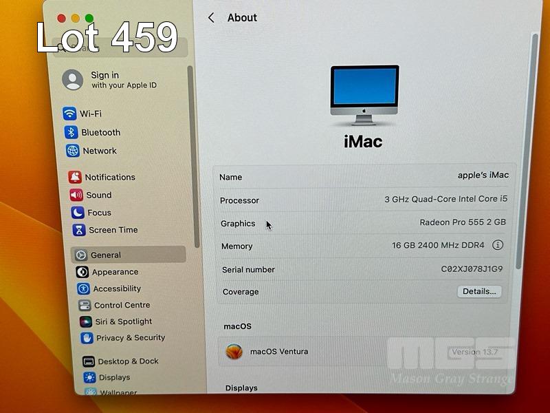 APPLE iMAC (A1418), CORE i5 7400 (7TH GEN) @ 3GHz, 16GB DDR4 RAM, 1TB FUSION DRIVE, BUILT-IN 21.5" RETINA DISPLAY (4096x2304), 2GB RADEON PRO 555 VIDEO, Wi-Fi, BLUETOOTH, MAC OS 13 INSTALLED (NO KEYBOARD, NO MOUSE, NO CABLE) S/N:C02XJ078J1G9