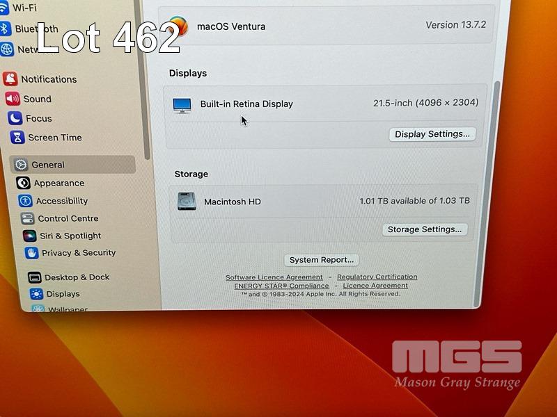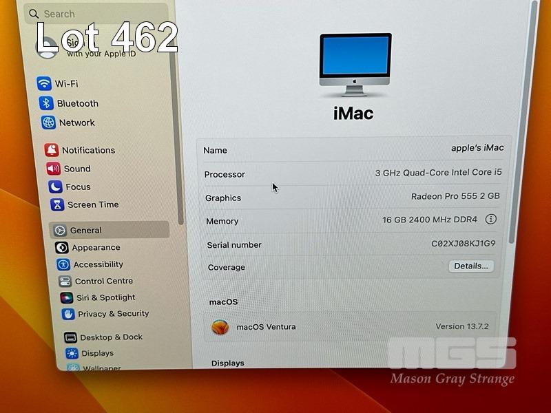 APPLE iMAC (A1418), CORE i5 7400 (7TH GEN) @ 3GHz, 16GB DDR4 RAM, 1TB FUSION DRIVE, BUILT-IN 21.5" RETINA DISPLAY (4096x2304), 2GB RADEON PRO 555 VIDEO, Wi-Fi, BLUETOOTH, MAC OS 13 INSTALLED (NO KEYBOARD, NO MOUSE, NO CABLE) S/N:C02XJ08KJ1G9
