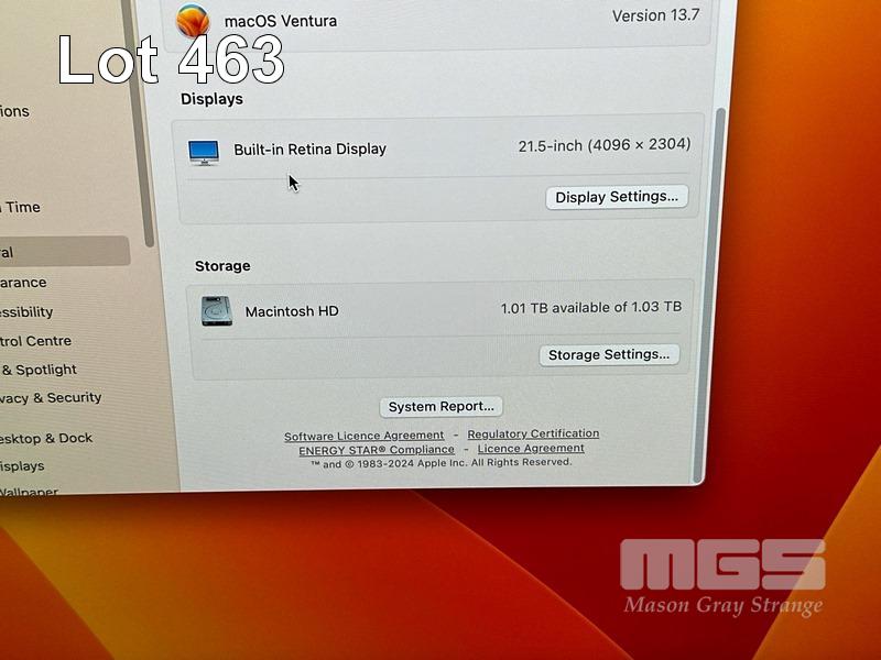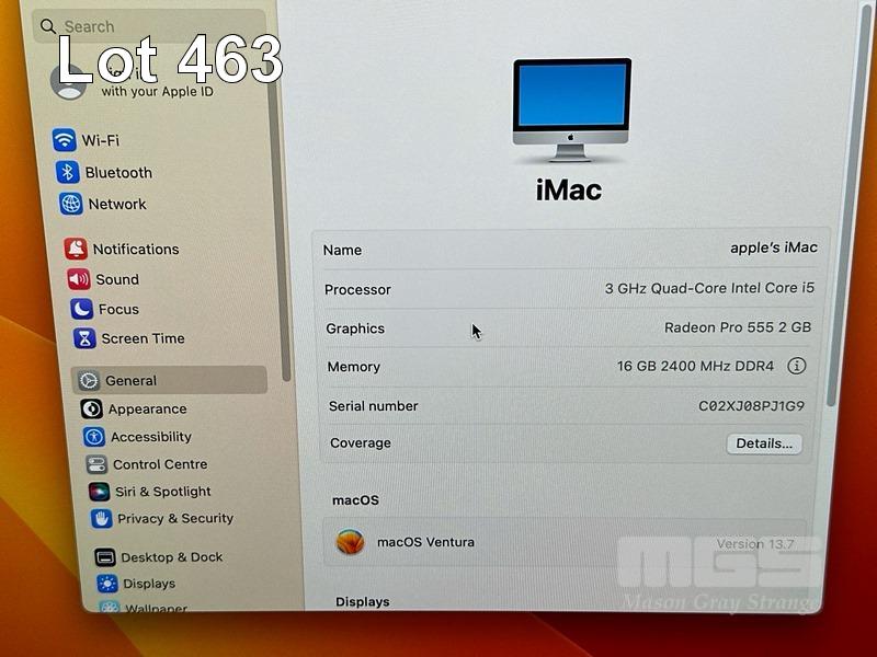 APPLE iMAC (A1418), CORE i5 7400 (7TH GEN) @ 3GHz, 16GB DDR4 RAM, 1TB FUSION DRIVE, BUILT-IN 21.5" RETINA DISPLAY (4096x2304), 2GB RADEON PRO 555 VIDEO, Wi-Fi, BLUETOOTH, MAC OS 13 INSTALLED (NO KEYBOARD, NO MOUSE, NO CABLE) S/N:C02XJ08PJ1G9