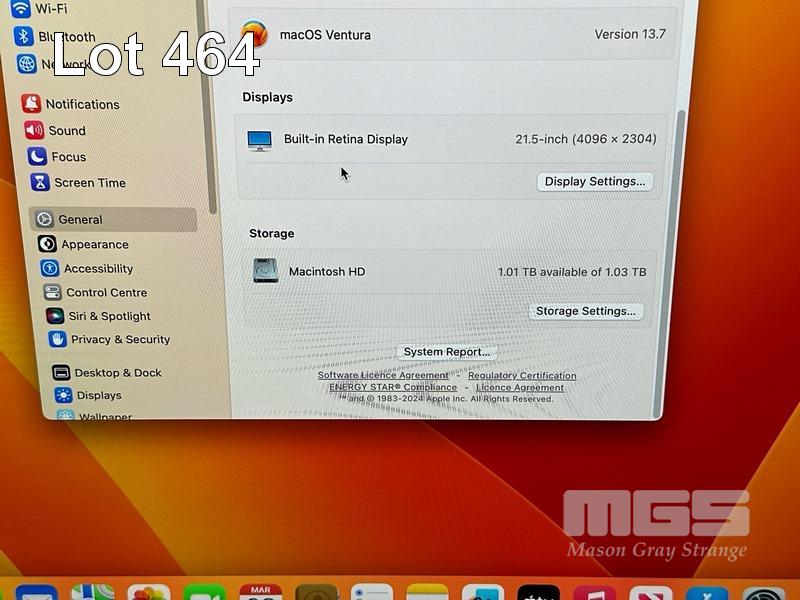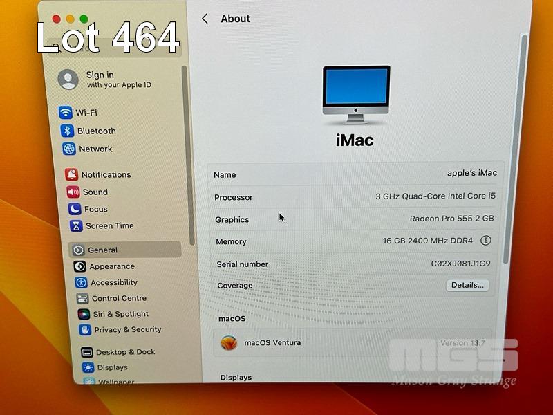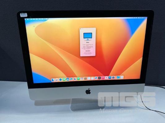 APPLE iMAC (A1418), CORE i5 7400 (7TH GEN) @ 3GHz, 16GB DDR4 RAM, 1TB FUSION DRIVE, BUILT-IN 21.5" RETINA DISPLAY (4096x2304), 2GB RADEON PRO 555 VIDEO, Wi-Fi, BLUETOOTH, MAC OS 13 INSTALLED (NO KEYBOARD, NO MOUSE, NO CABLE) S/N:C02XJ081J1G9